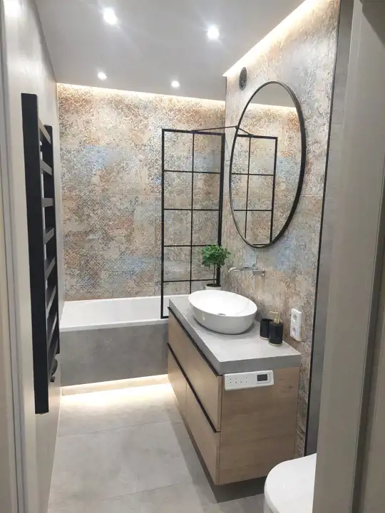 Łazienka z wanną w klasycznej, nowoczesnej glazurze wyposażona w inteligentną toaletę (tzw. toaleta japońska).