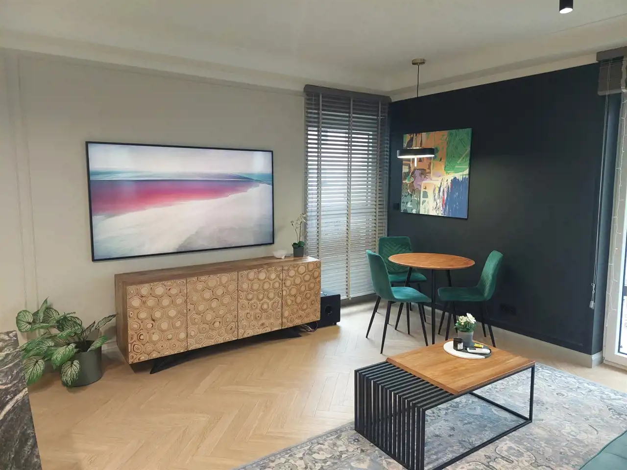 Całe mieszkanie zaprojektowane w przemyślany sposób, tak by łączyć klasykę z nowoczesnością, a wysokiej klasy sprzęty AGD i RTV ułatwiają życie i czynią je komfortowym.
