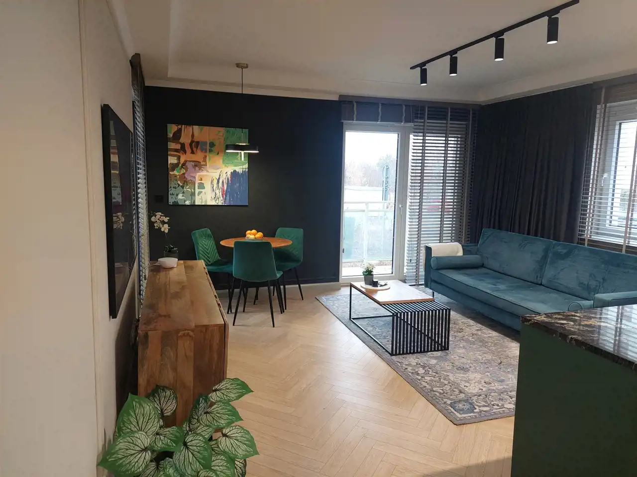 Salon narożny z oknami na 3 strony świata, z wyjściem na balkon.