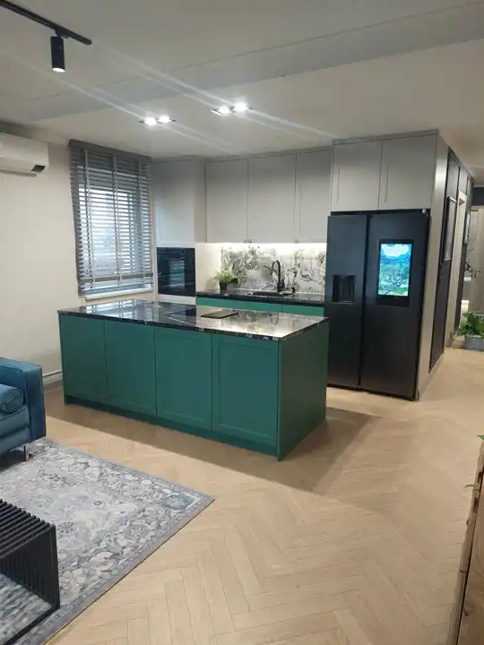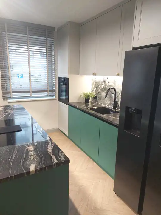 Kuchnia w pełni wyposażona w sprzęt AGD: lodówka z zamrażarką, zmywarka, płyta indukcyjna z pochłaniaczem, piekarnik, zlewozmywak z młynkiem.