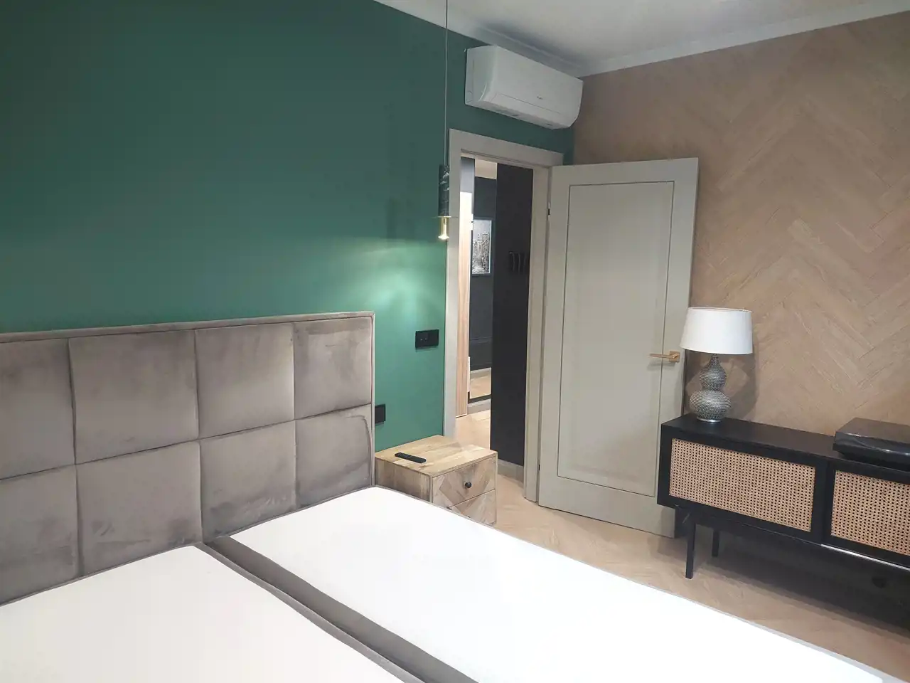 Przytulna sypialnia z zabudową szafową i małżeńskim łóżkiem, również wyposażona w klimatyzację.