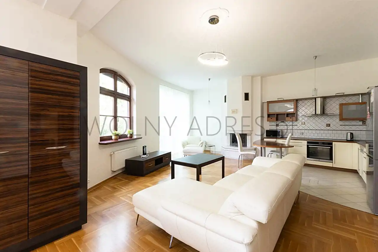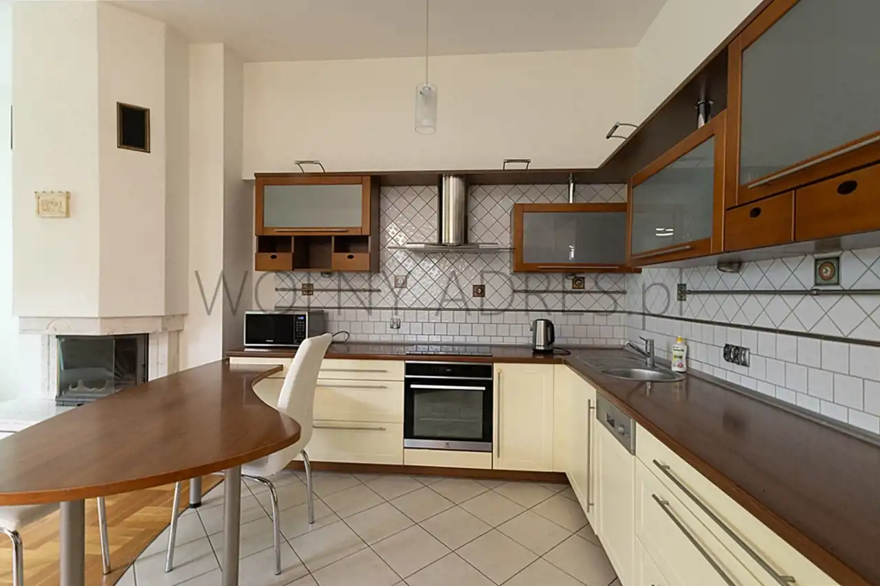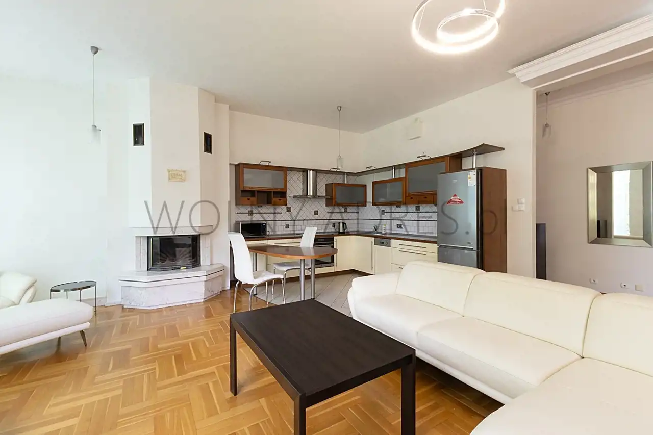 - obszerny salon z kominkiem, połączony z aneksem kuchennym i jadalnym, z wyjściem na duży, słoneczny balkon.