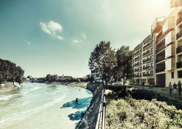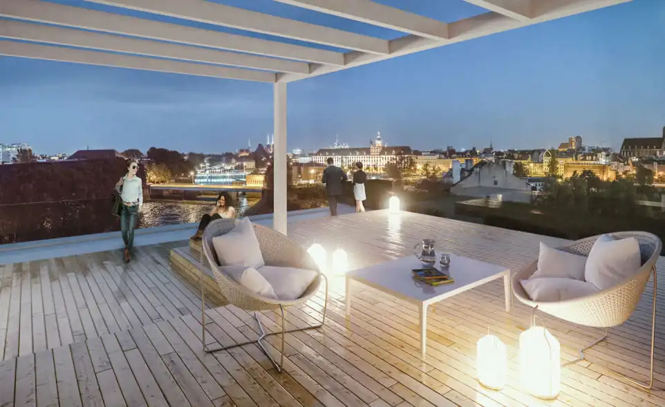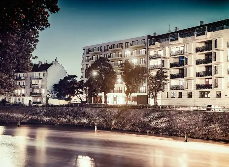 Opis inwestycji: Inwestycja obejmuje 6-kondygnacyjny budynek o niepowtarzalnej, ciekawej bryle, w którym zaprojektowano 70 lokali mieszkalnych. Jest to inwestycja otwarta na rzekę, łatwo dostępna dla osób poruszających się pieszo, rowerem bądź komunikacją miejską. Budynek z licznymi przeszkleniami oraz tarasem widokowym położonym na ostatnim piętrze. Tym, co wyróżnia mieszkania w tej inwestycji, to z pewnością nietypowa w dzisiejszym budownictwie trzymetrowa wysokość mieszkań. Dla wygody przyszłych mieszkańców inwestycja posiadać będzie garaż podziemny oraz cichobieżne windy. Budynek monitorowany, ponadto nad bezpieczeństwem mieszkańców czuwać będzie ochrona fizyczna.