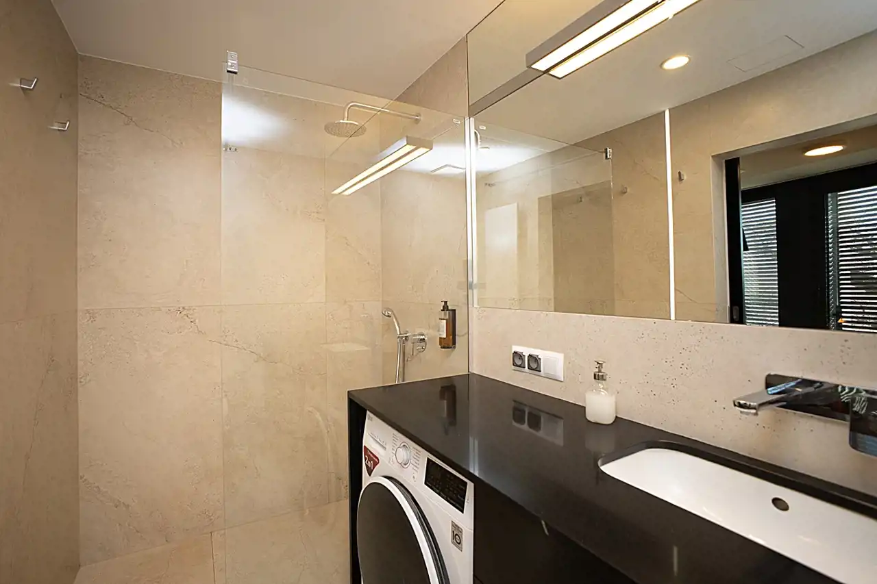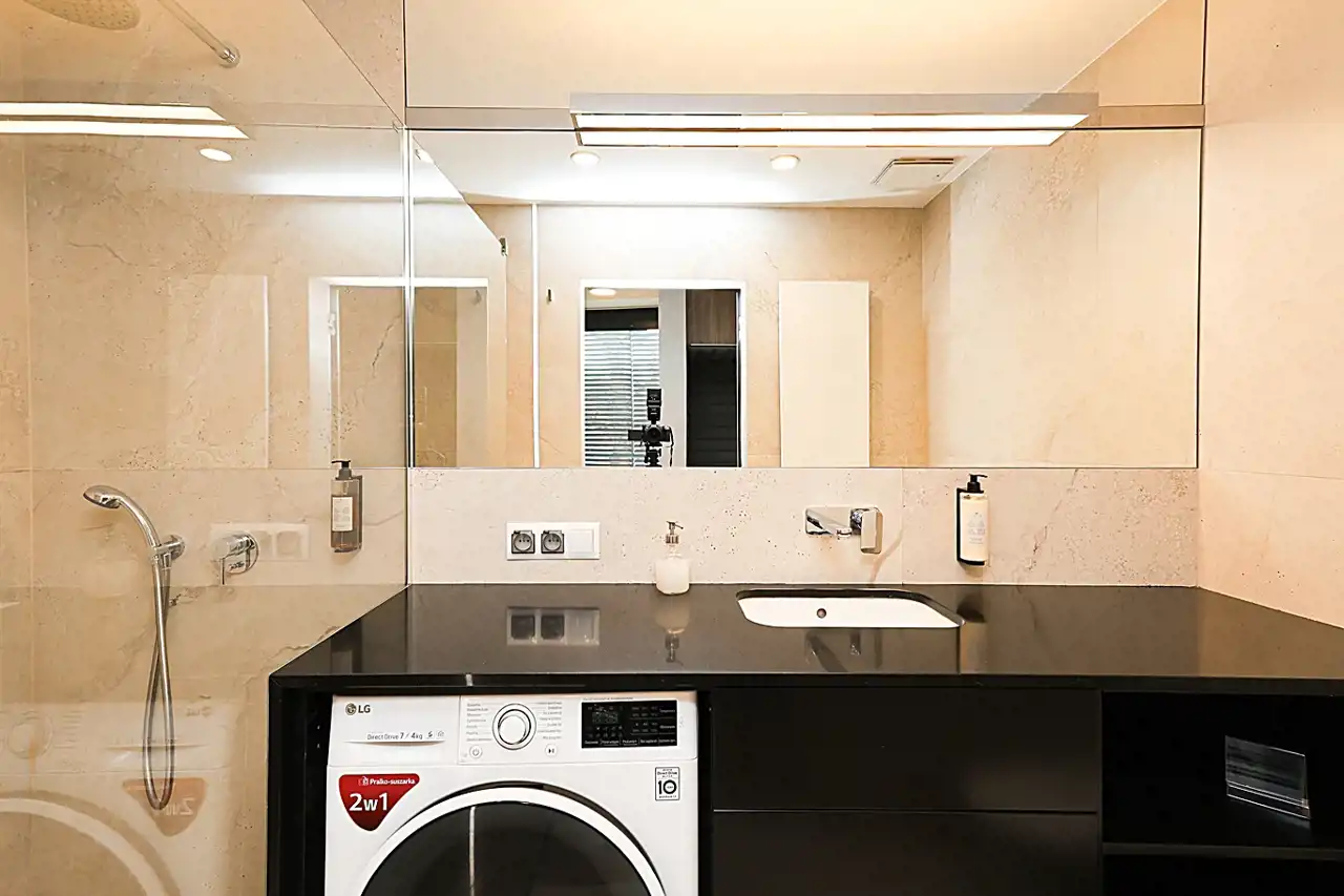 Całkowicie umeblowana i wyposażona 53,67m2 przestrzeń zagospodarowana na obszerny salon z aneksem kuchennym z widokiem na rzekę, oraz duża, wygodna sypialnia z garderobą. Komfortowa łazienka z kabiną prysznicową i pralką.