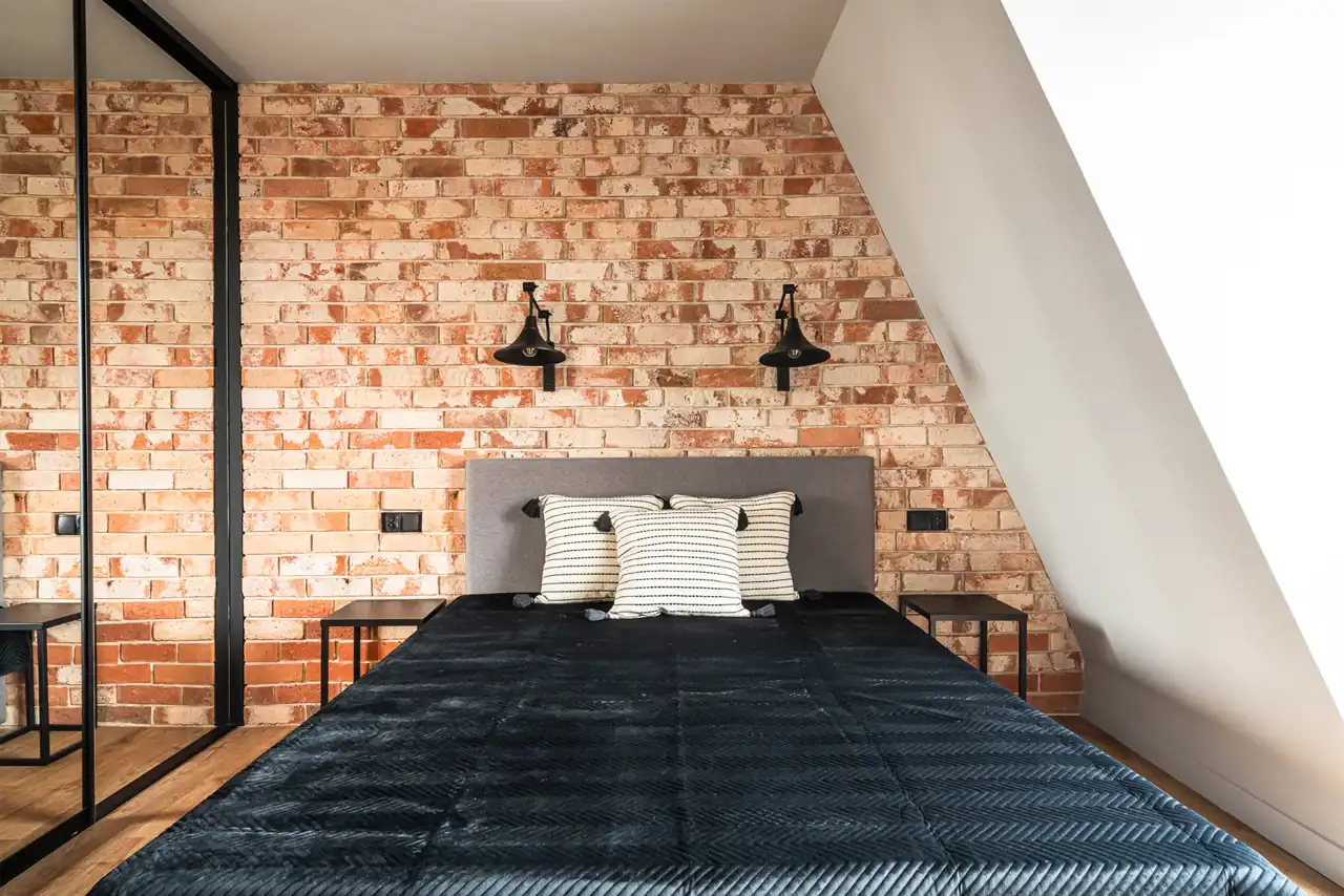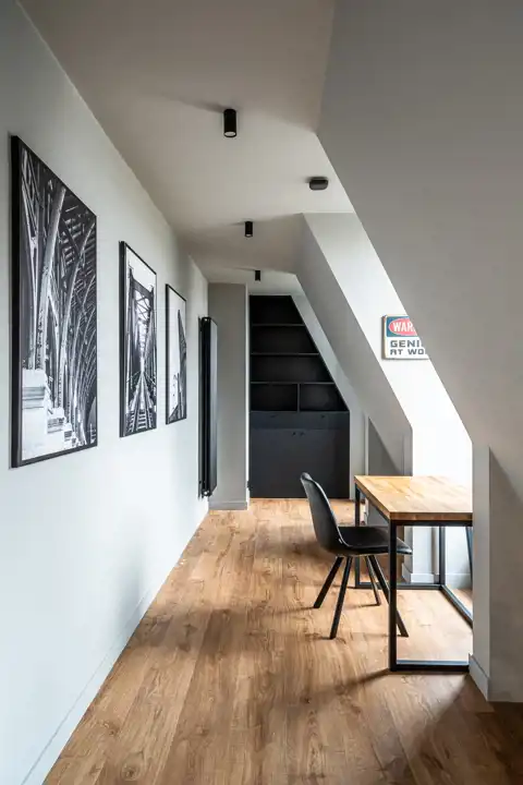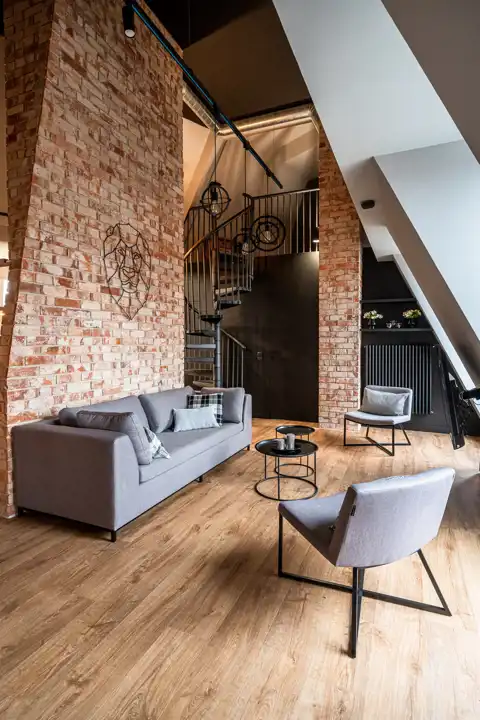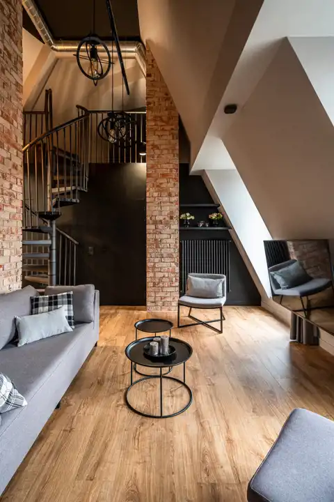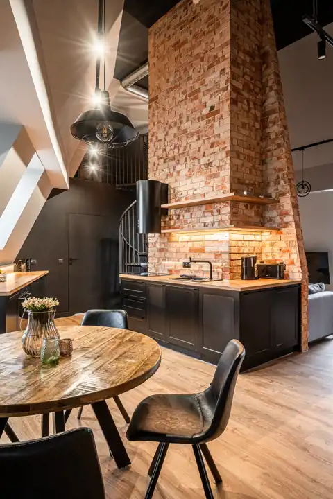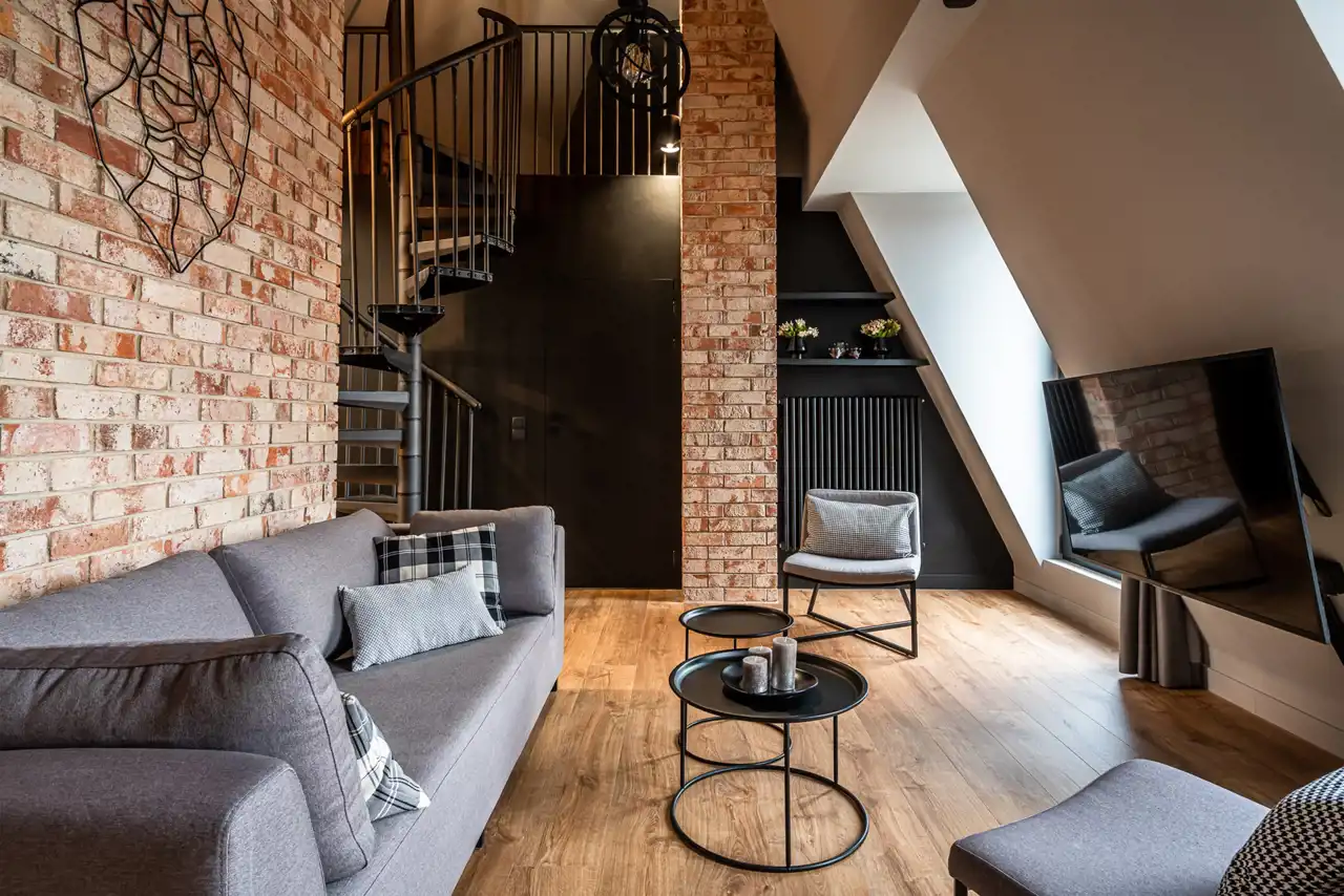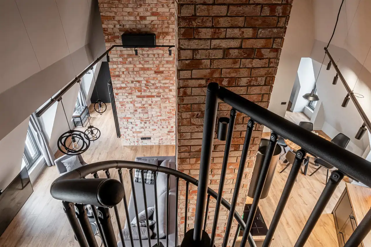 Mieszkanie w stylu loftowym charakteryzuje się unikalnym designem oraz wysokimi sufitami. Antresola stwarza dodatkową przestrzeń, w której znajduje się garderoba, co czyni wnętrze jeszcze bardziej funkcjonalnym.