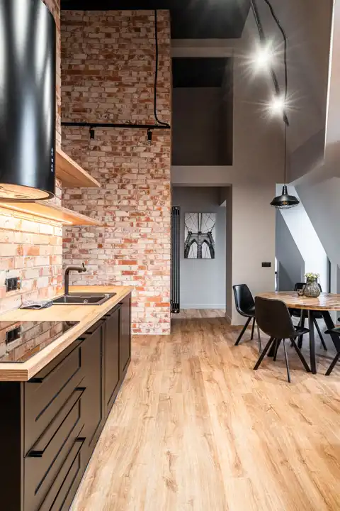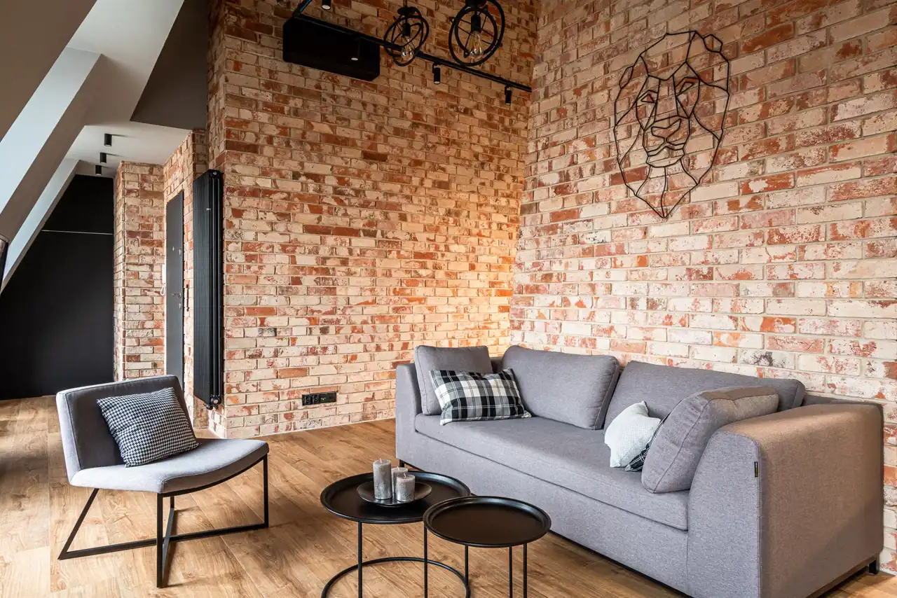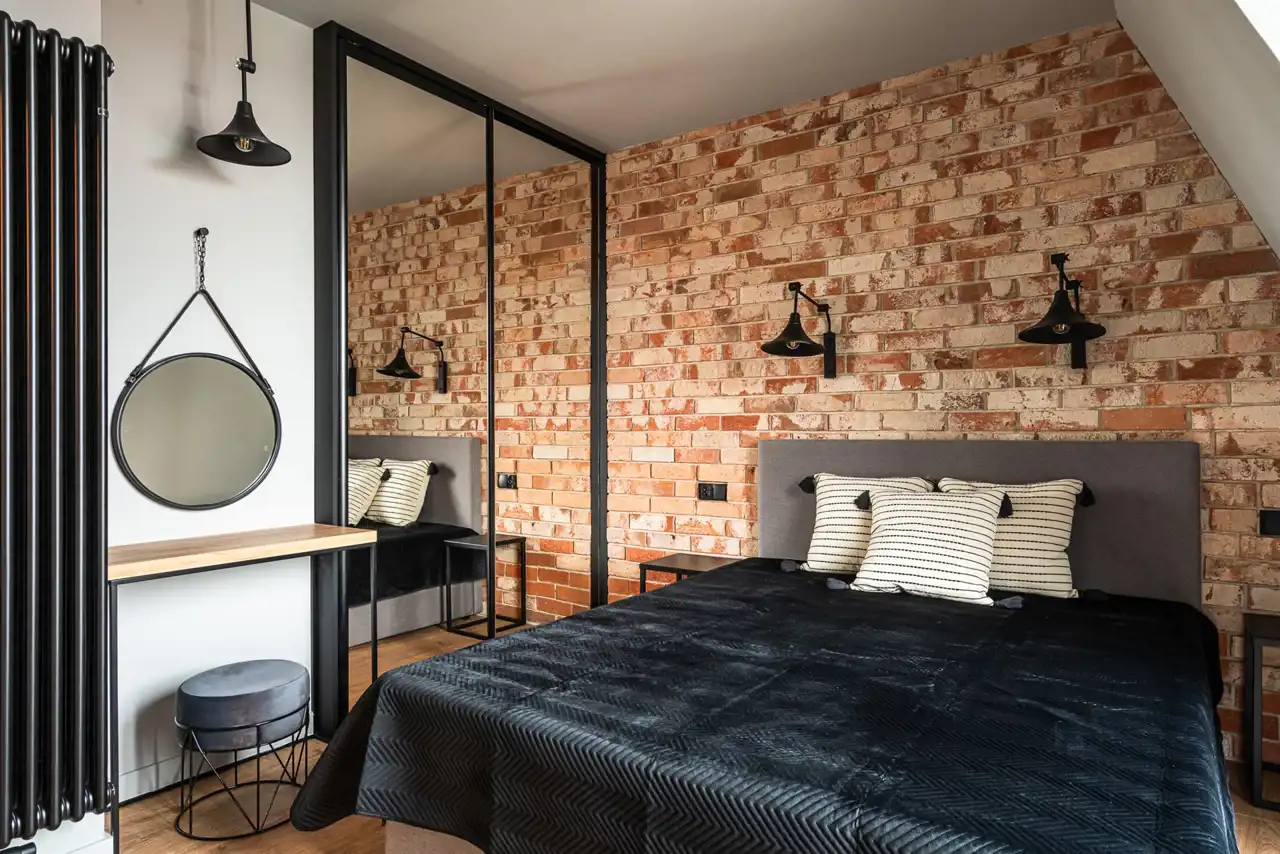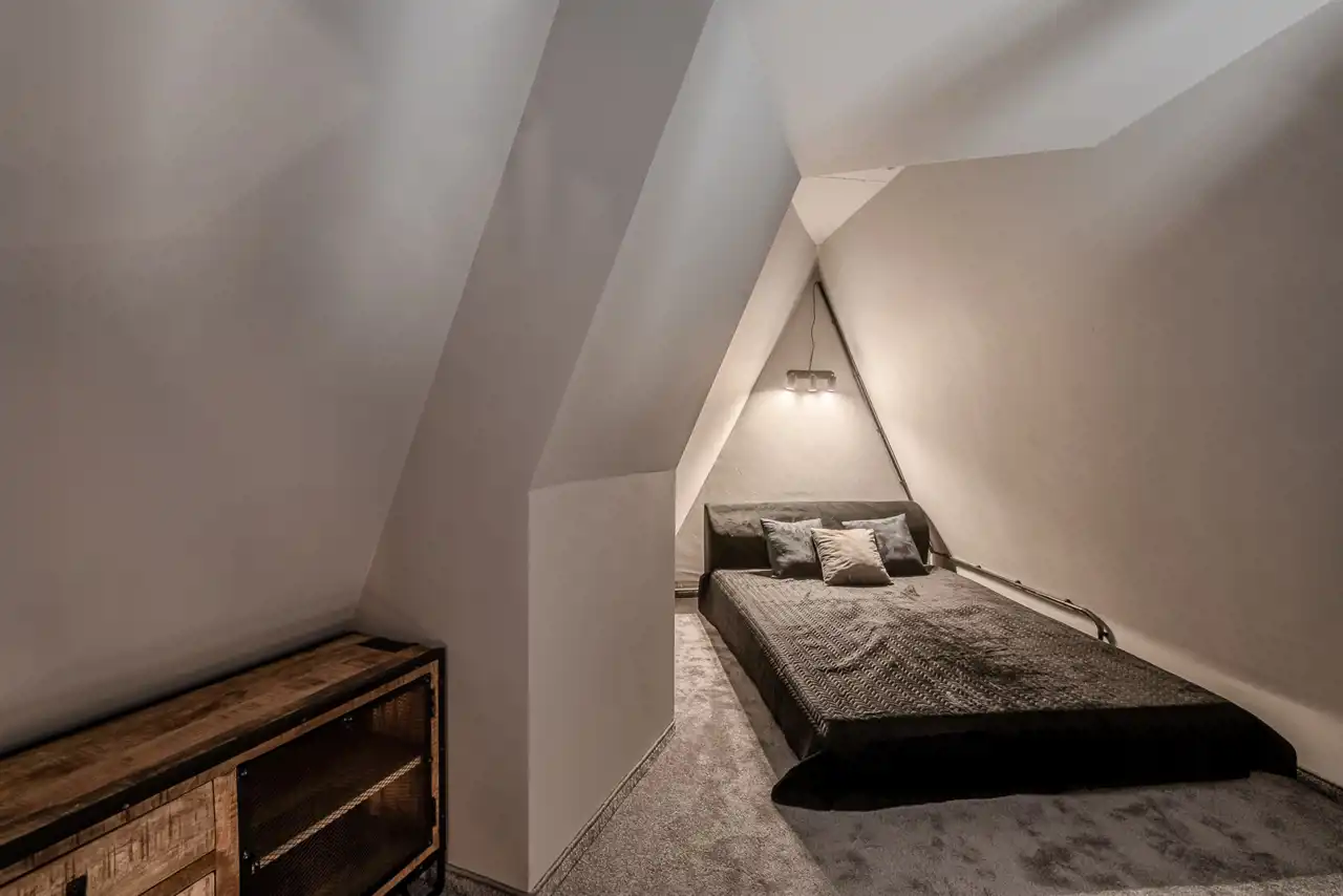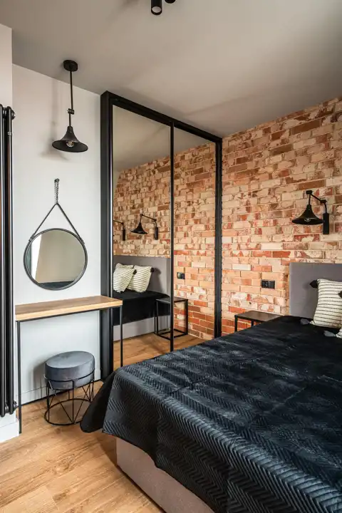 Mieszkanie w stylu loftowym charakteryzuje się unikalnym designem oraz wysokimi sufitami. Antresola stwarza dodatkową przestrzeń, w której znajduje się garderoba, co czyni wnętrze jeszcze bardziej funkcjonalnym.