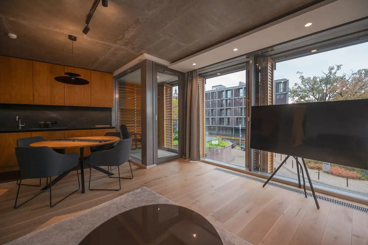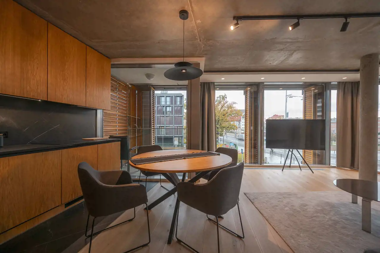 Już od progu wita Cię obfitość naturalnego światła wpadającego przez duże przeszklenia, co daje poczucie przestrzeni i ciepła. Sercem tego miejskiego azylu jest salon — przestrzeń idealna do wypoczynku i spotkań. Okna od podłogi do sufitu kadrują widoki na miasto, a miękkie sofy zapraszają do relaksu po długim dniu.