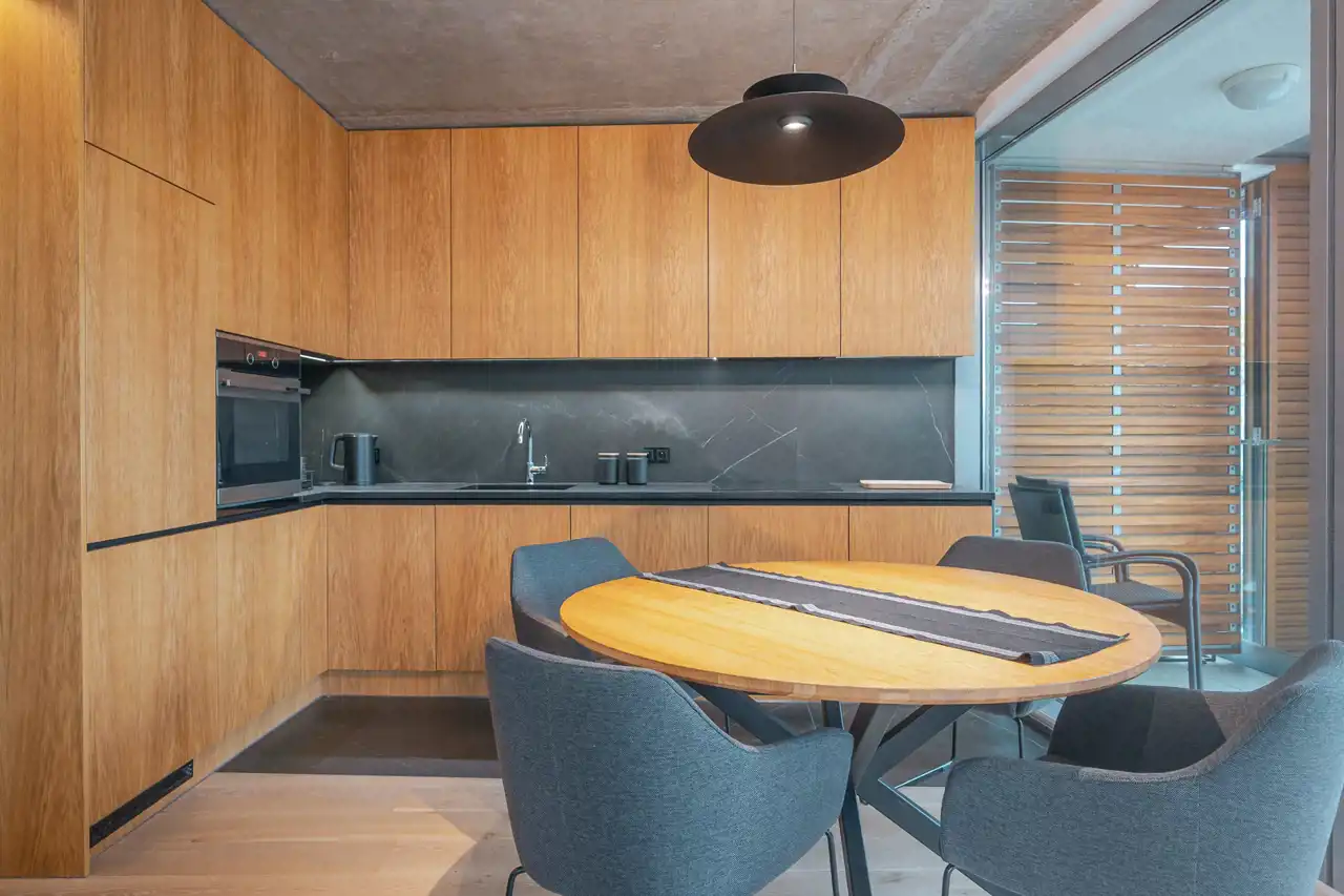 Nowoczesne udogodnienia są dyskretnie zintegrowane: system kontroli klimatu oraz przemyślane, punktowe oświetlenie pozwalają dobrać nastrój o każdej porze. Elegancka kuchnia (niewidoczna na zdjęciach) ucieszy miłośników gotowania wysokiej klasy sprzętami i dużą powierzchnią roboczą.