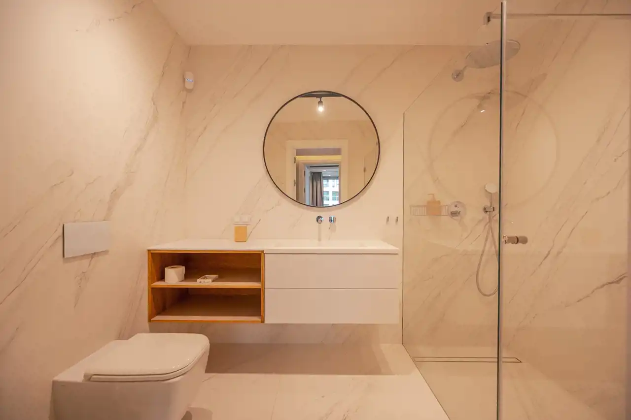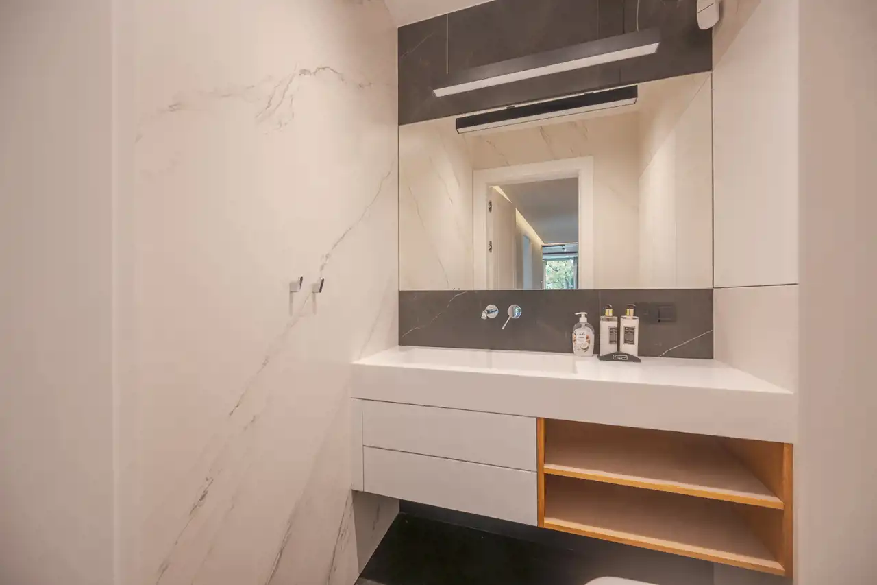 Obie łazienki podkreślają luksusowy charakter wnętrza. Wykończone płytkami o wyglądzie marmuru oferują przeszklone prysznice typu walk-in, wiszące szafki z umywalkami i nowoczesną armaturę. Czyste linie i neutralna paleta tworzą klimat domowego spa — na dobry początek dnia i spokojny wieczór.