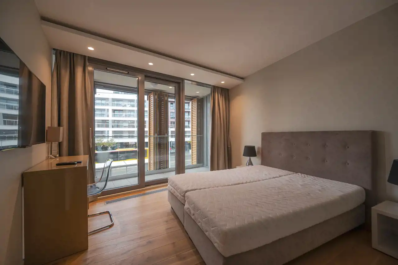 Dwie przestronne sypialnie, w tym główna o powierzchni 17,0 m², są oazami spokoju. Ciepła podłoga z drewna buduje przytulny klimat, który kontrastuje ze smukłą, nowoczesną formą. Duże okna zapewniają dużo światła dziennego i widoki na panoramę miasta.