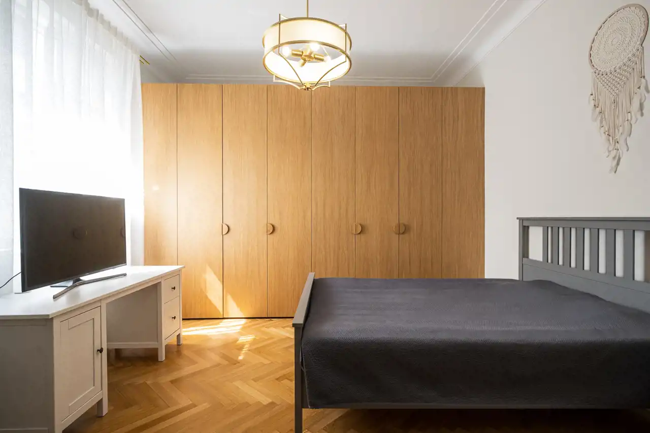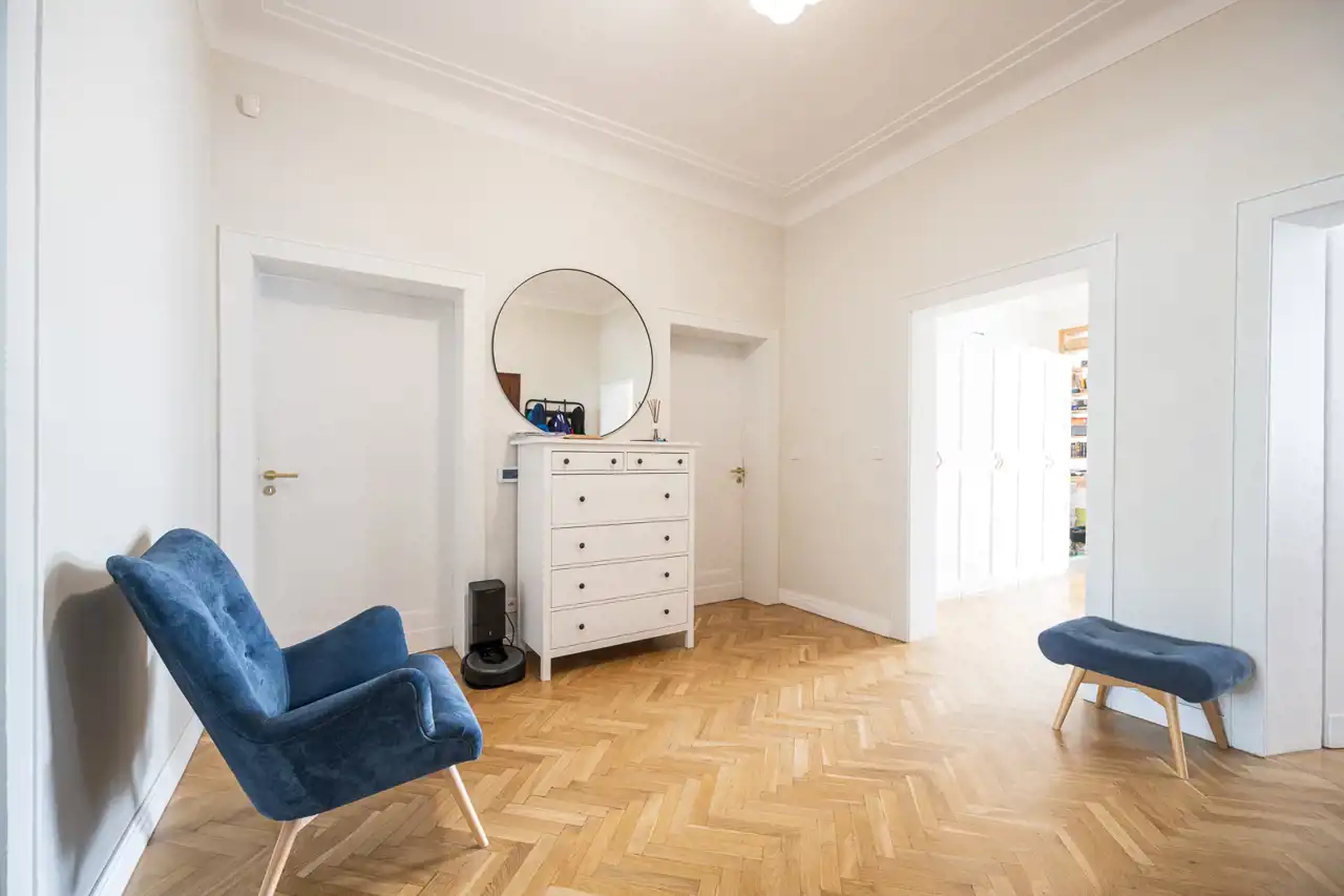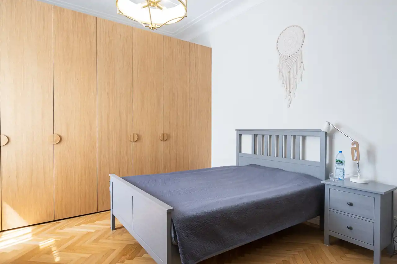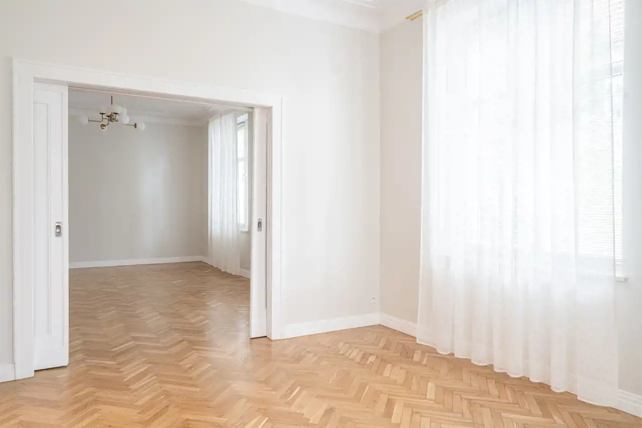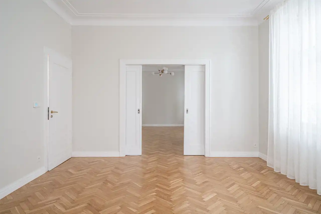 Serce apartamentu to dwa przestronne pokoje dzienne połączone ze sobą przesuwanymi, pięknie odrestaurowanymi drzwiami. Tu centralne miejsce zajmuje stół dedykowany rodzinnym spotkaniom. Piękne, wysokiej klasy PCV okna wpuszczają do wnętrz mnóstwo naturalnego światła.