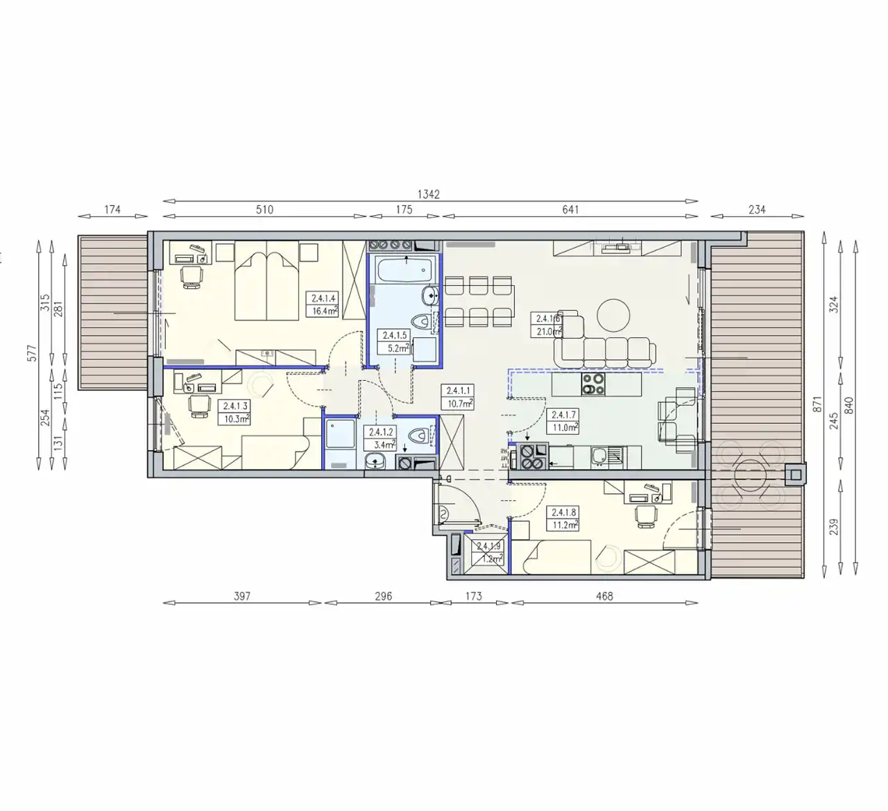 Mieszkanie (90 m2) jest czteropokojowe z bardzo dużym przestronnym tarasem (20 m2) z widokiem na Odrę i balkonem (6m2)