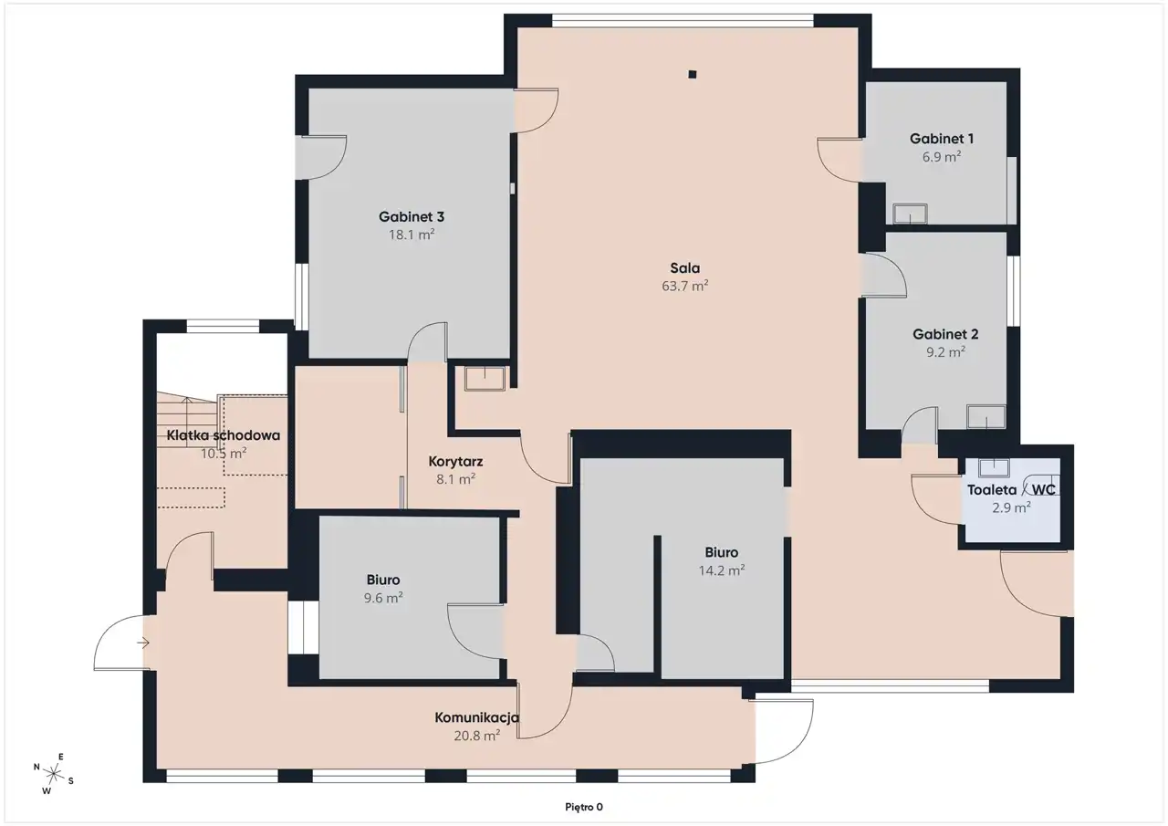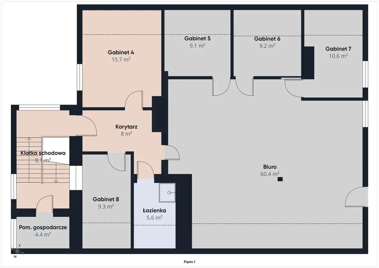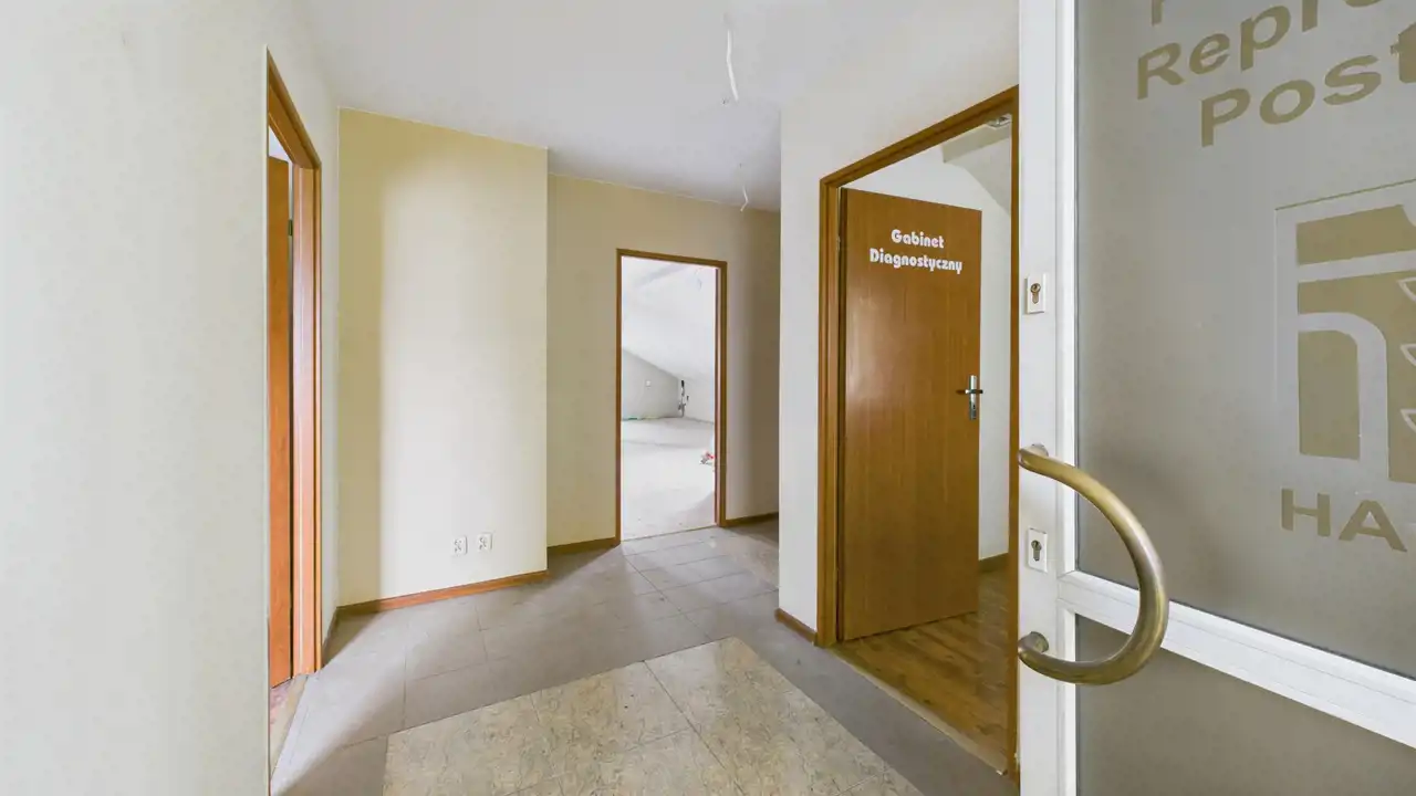 Budynek składa się z parteru oraz poddasza użytkowego, obejmujących liczne pomieszczenia idealne na gabinety, biura, sale konsultacyjne, pomieszczenia pracownicze, recepcję oraz zaplecze socjalne.