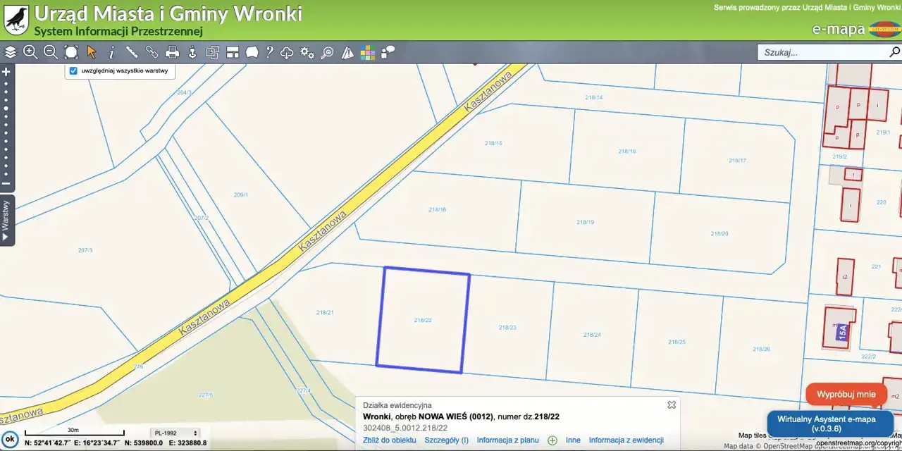 NEXT Nieruchomości poleca na sprzedaż działkę budowlaną położoną przy ulicy Kasztanowej w miejscowości Nowa Wieś ( na granicy z Wronkami ) o powierzchni 800m2.