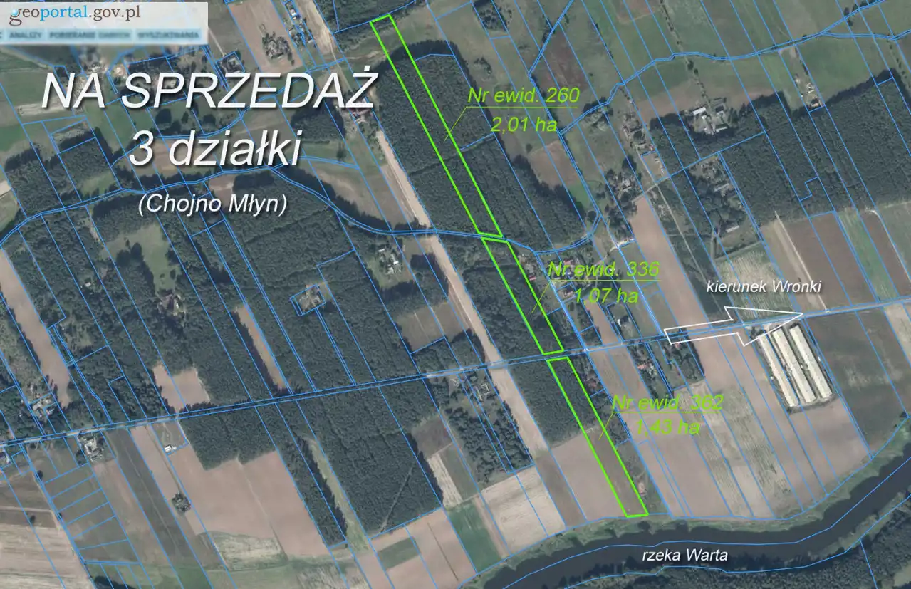 Na sprzedaż niezwykle urokliwe działki nr ewid. 260, 336 i 362 o łącznej powierzchni 45 100 m2 położone w miejscowości Chojno Młyn, gmina Wronki, powiat szamotulski.