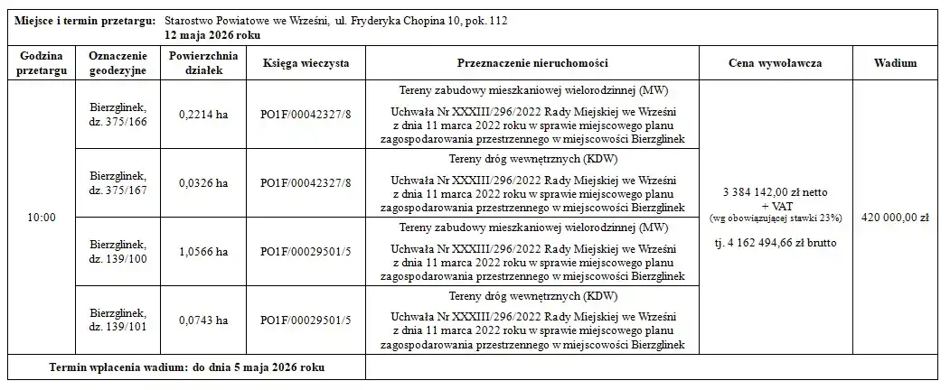 - Przetarg odbędzie się w pok. nr 112, I piętro budynku Starostwa Powiatowego we Wrześni przy ulicy Fryderyka Chopina 10.
