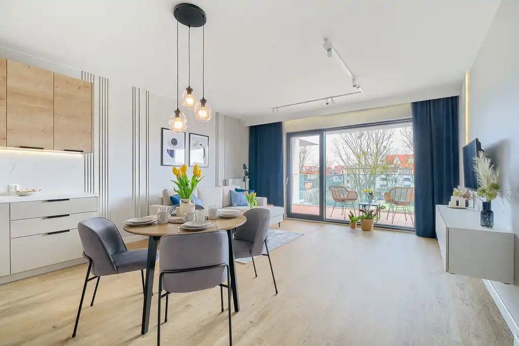 salon z aneksem kuchennym i wyjściem na loggię z pięknym widokiem