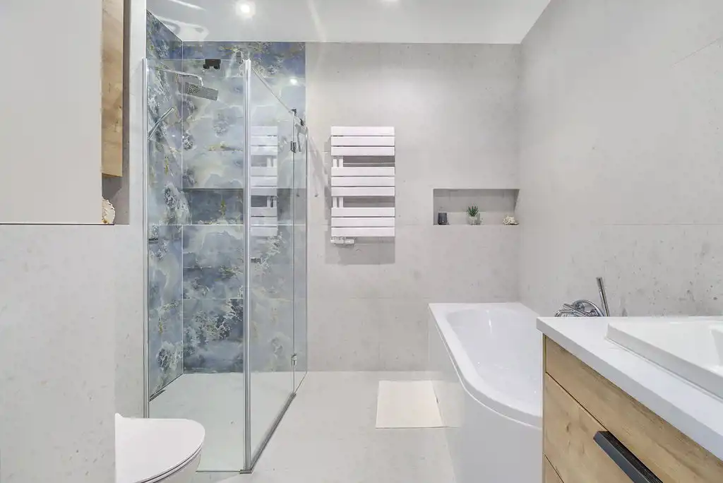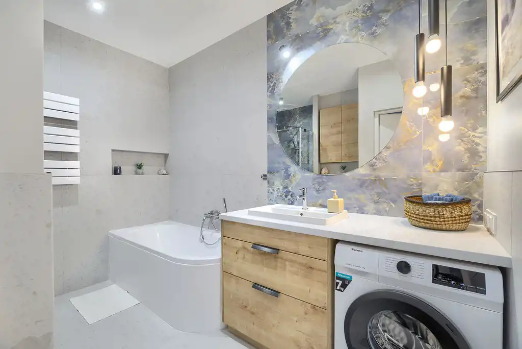 łazienka z wanną i kabiną prysznicową oraz wc wraz z pralką