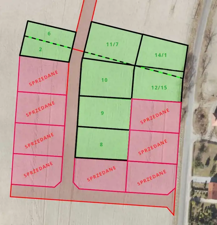 Do ceny działki nr 8, 9, 10, 6/2, 11/7 należy doliczyć kwotę 15 000 PLN za udział w utwardzonej drodze osiedlowej i doprowadzenie mediów (prąd i woda).
