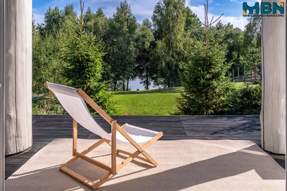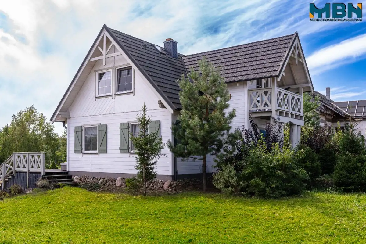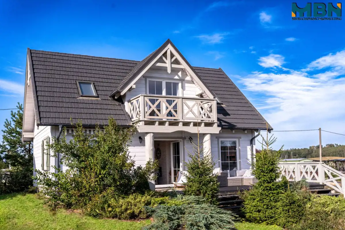 Działka dzięki umiejscowieniu na pagórku ma panoramiczny widok na jezioro i okolicę;