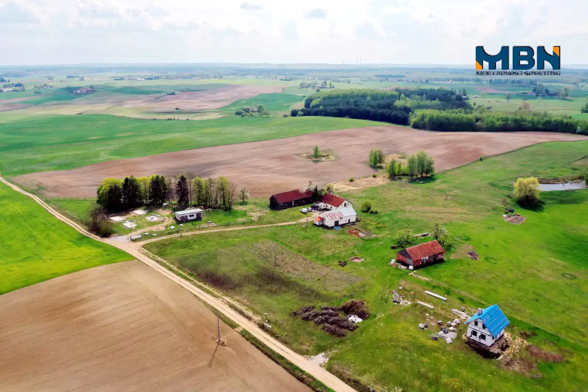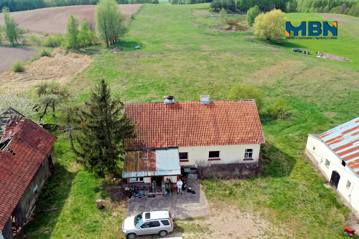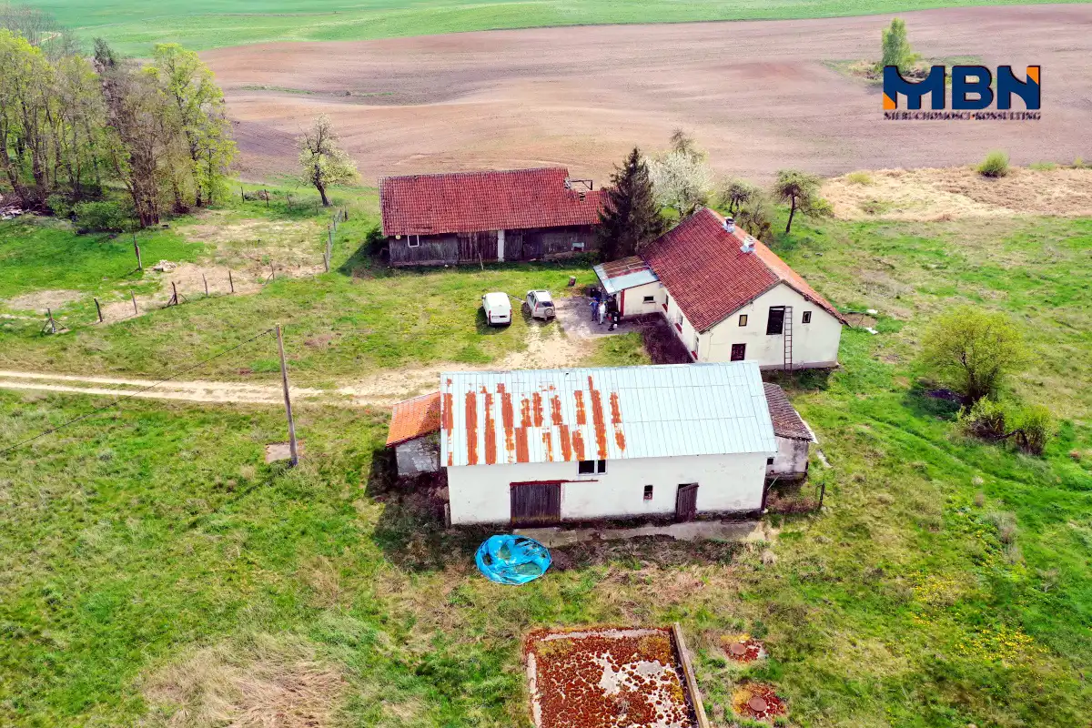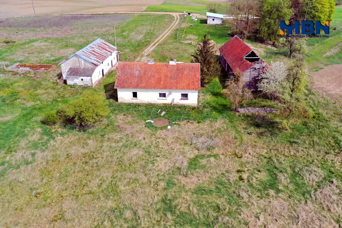 Nieruchomość zabudowana budynkiem mieszkalnym jednorodzinnym oraz budynkami gospodarczymi położona na terenach rolnych wśród łąk i pól.