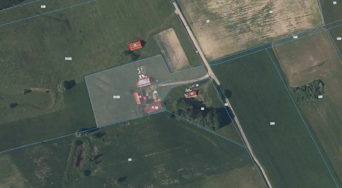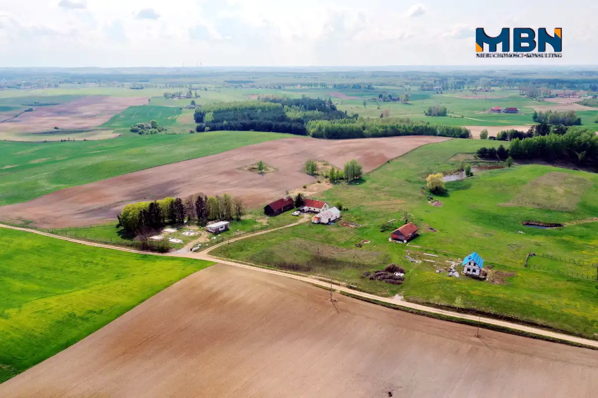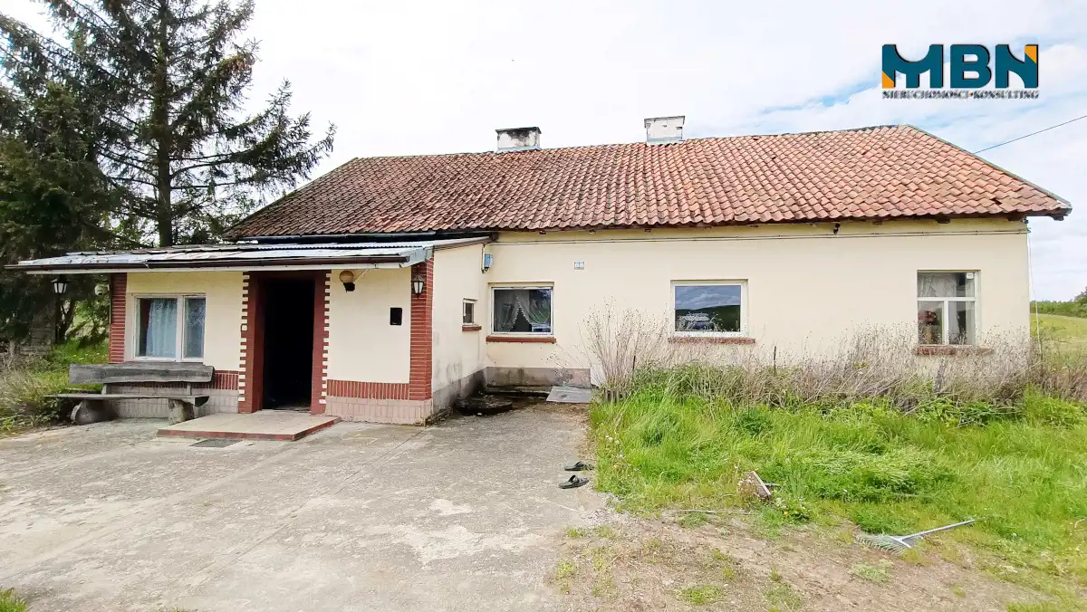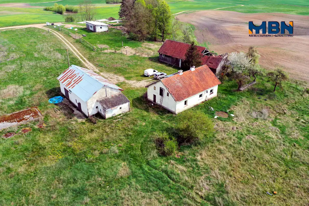Nieruchomość zabudowana budynkiem mieszkalnym jednorodzinnym oraz budynkami gospodarczymi położona na terenach rolnych wśród łąk i pól.
