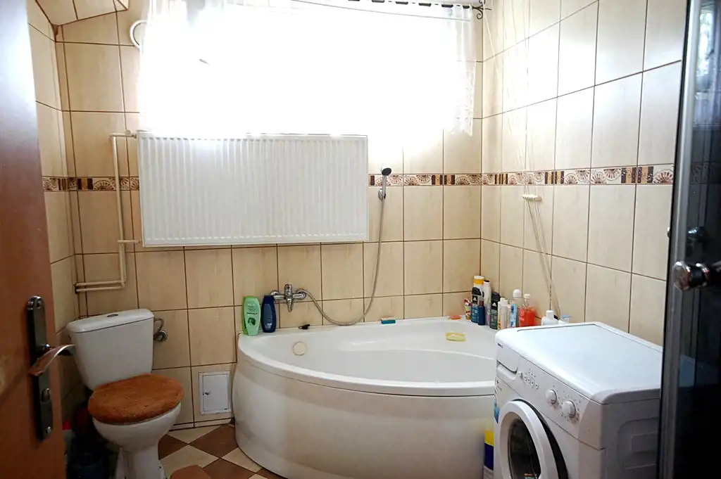 ok. 6,38m2 – na ścianach nowsza glazura, na podłodze terakota, kabina prysznicowa z hydromasażem i deszczownicą, wanna narożnikowa, 2 okna, razem z WC;