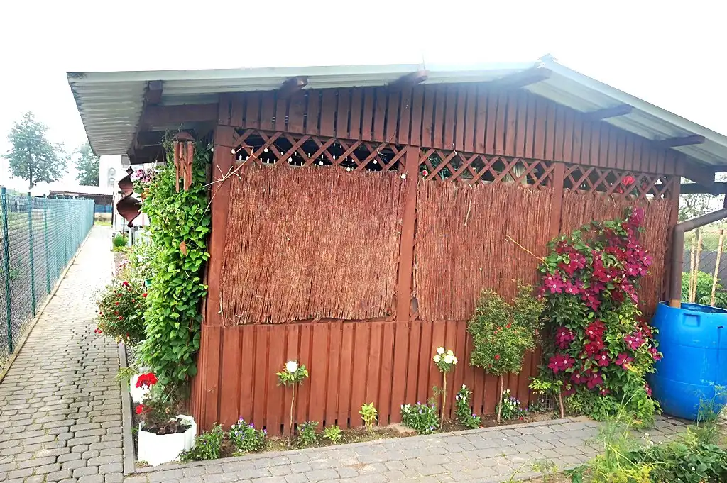DZIAŁKA I -(własność) o pow. 345m2, w całości ogrodzona, duża drewniana altana. Bardzo ładnie zagospodarowana działka z licznymi nasadzeniami i ogródkiem warzywnym, ścieżki wyłożone polbrukiem.