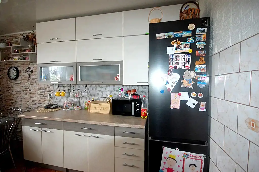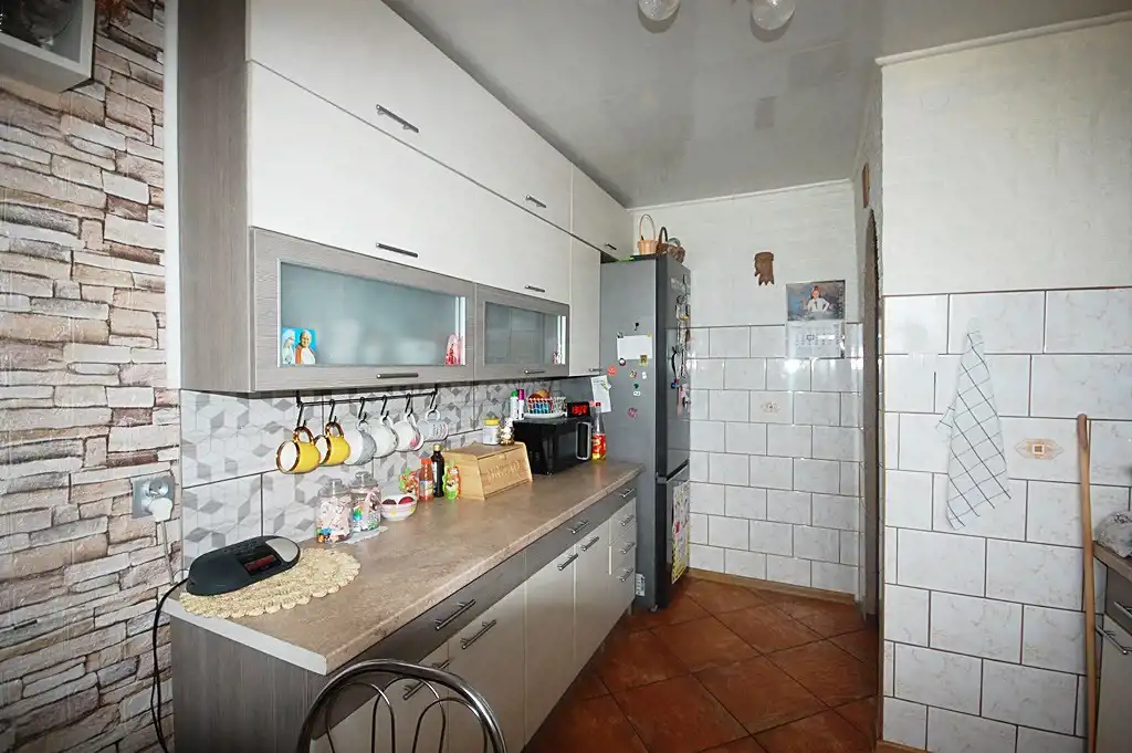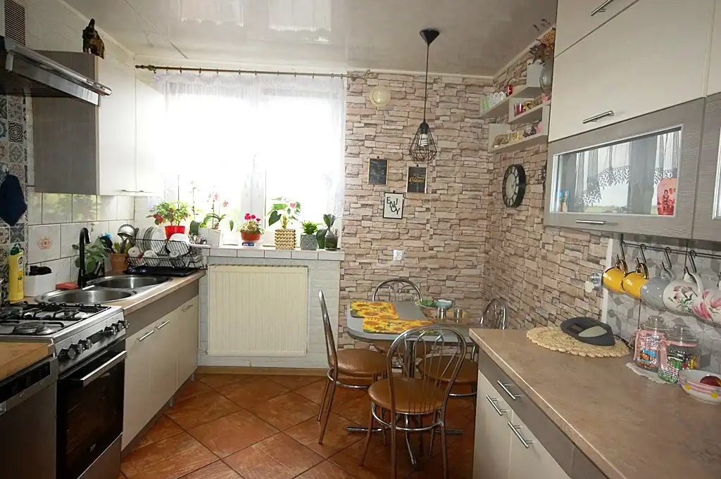 ok. 9,20m2 – na ścianach częściowo płytki ozdobne typu "cegiełka", fartuch glazury pomiędzy meblami, na podłodze terakota.