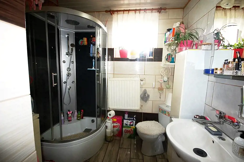 ok. 5,08m2 – na ścianach nowa glazura, na podłodze nowa terakota, kabina prysznicowa z hydromasażem, umywalka z szafką, okno;