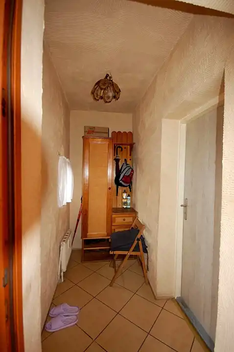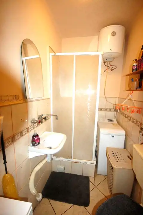 ok. 3,75m2 – na ścianach glazura do 1/2 wysokości , na podłodze kafle, razem z WC, kabina natryskowa, grzejnik drabinkowy ciepła woda z bojlera elektrycznego.