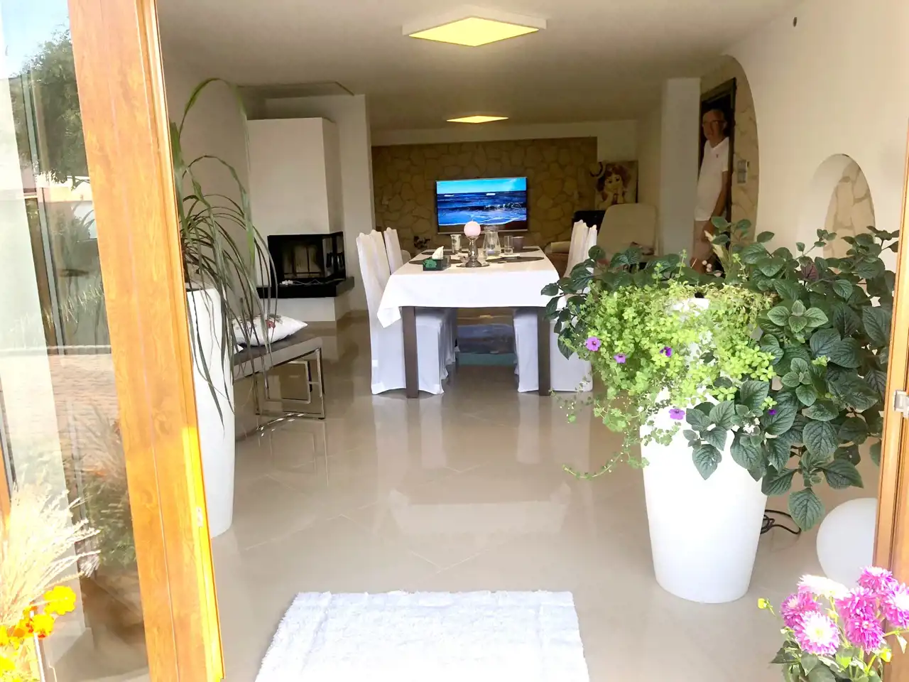 1. Salon ok. 39,40 m2 ściany gipsowane-malowane, z elementami ściennymi zdobionymi płytkami, podłoga w kaflach gresowych, stylowe ścienne i sufitowe oświetlenie ledowe, duże tarasowe drzwi pcv+okna pcv /złoty dąb/, z roletami zewnętrznymi elektrycznymi, czynny kominek