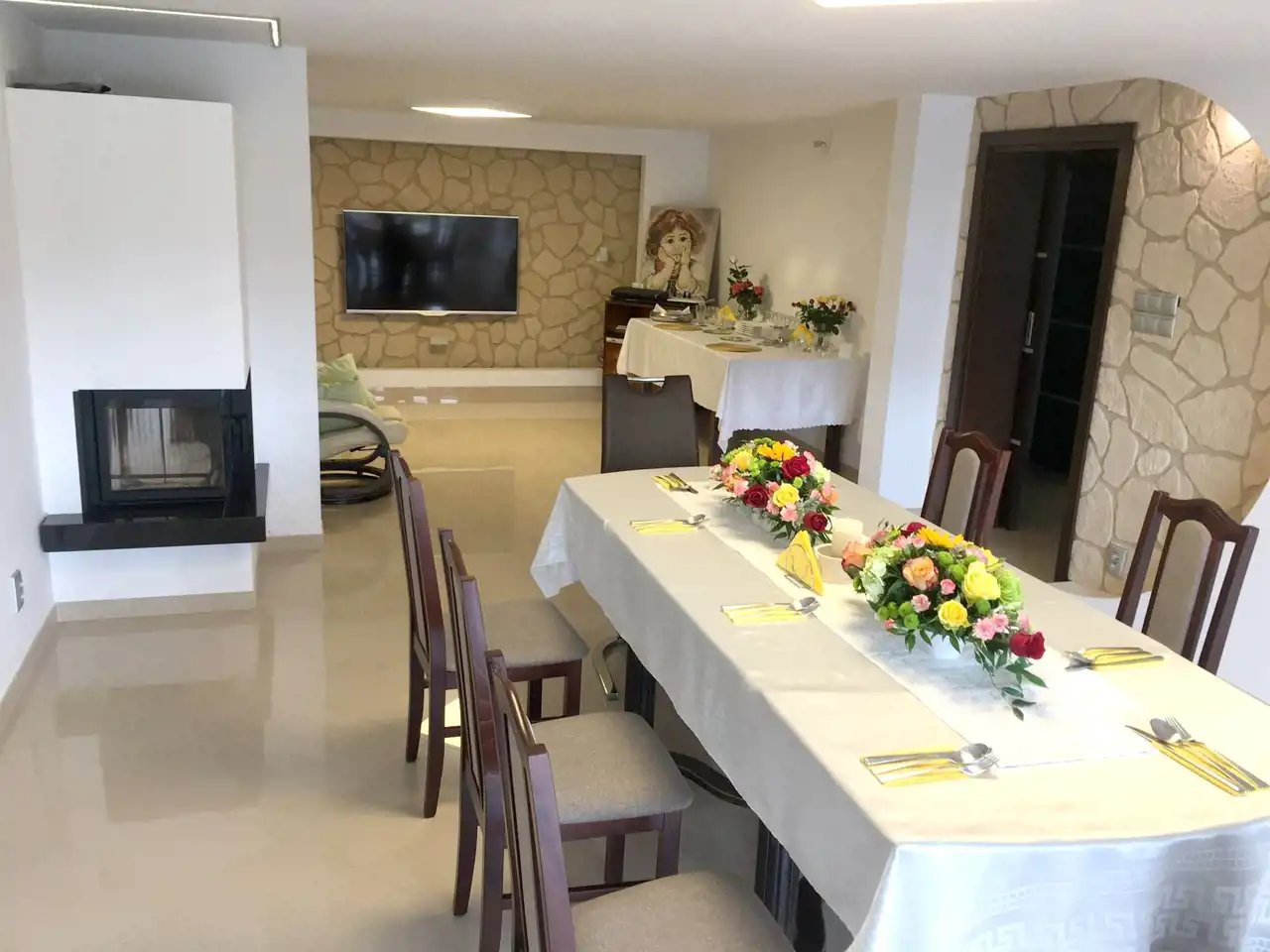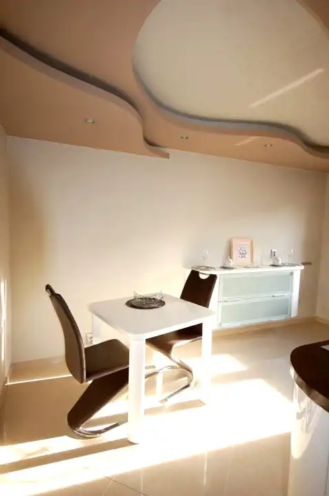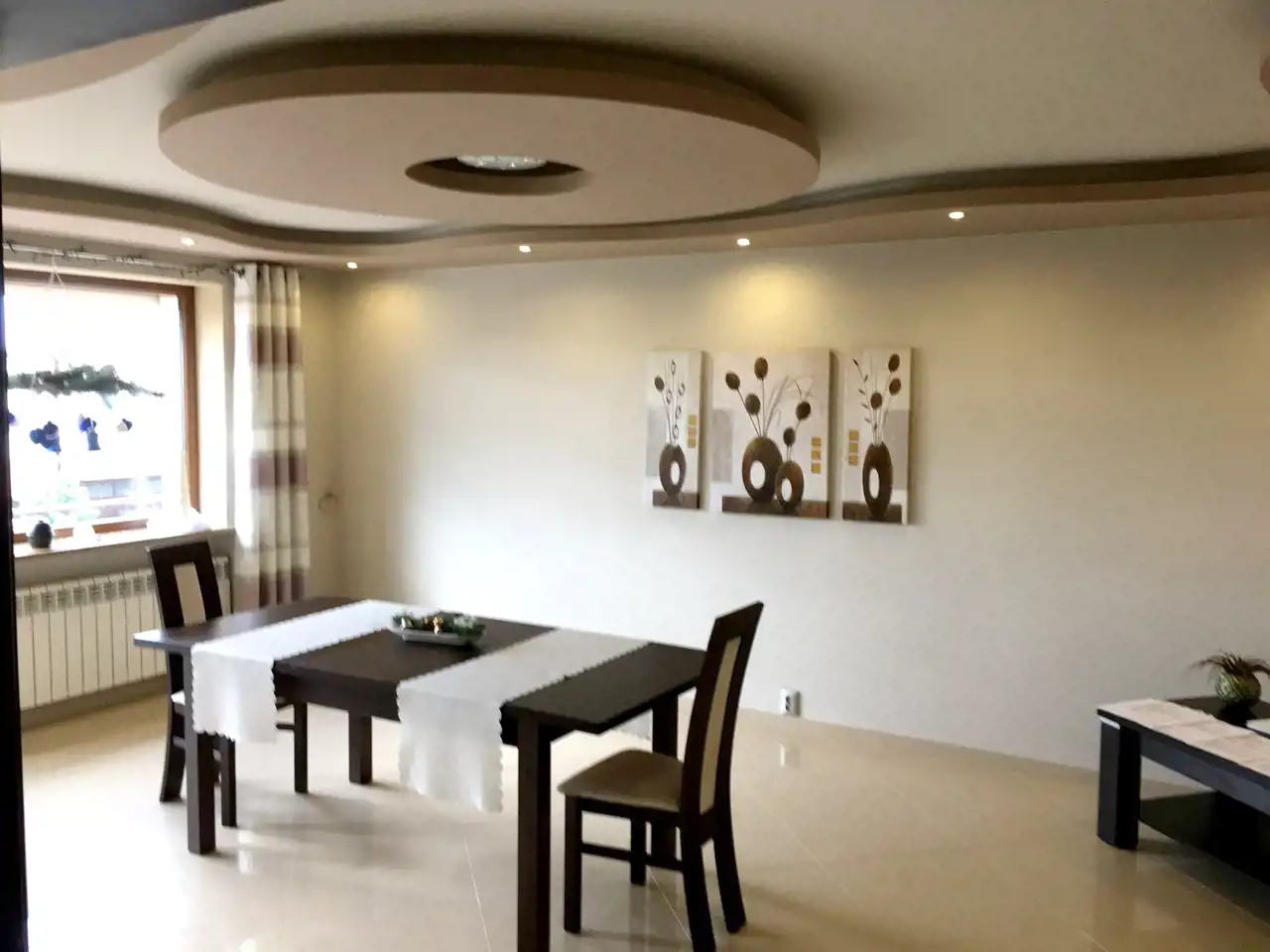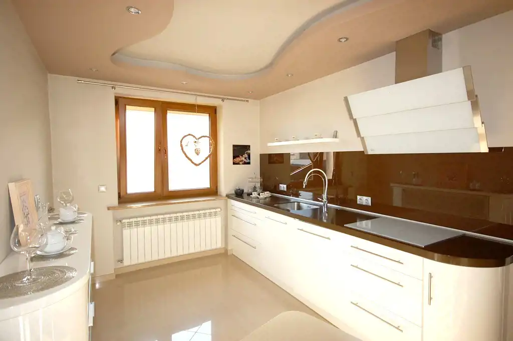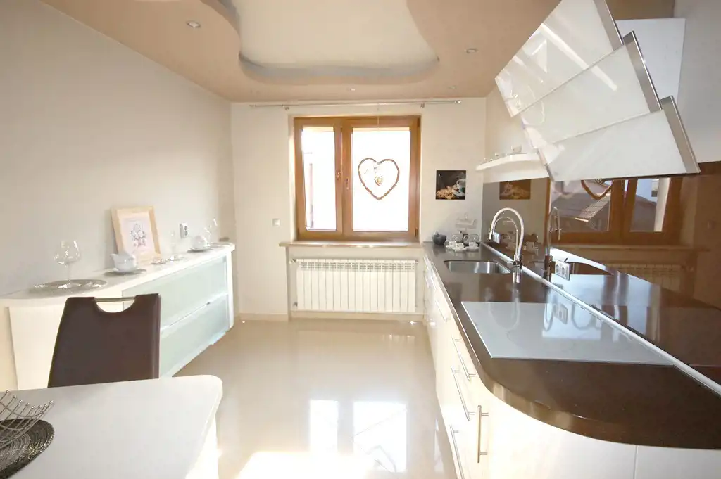 4.Kuchnia ok 11,30 m2 podłoga gres,ściany gipsowane-malowane, sufit ozdobny-podwieszany z oświetleniem ledowym, w cenie pozostaje zabudowa kuchni wraz z AGD /płyta indukcyjna Bosch, pochłaniacz Neto, lodówka Bosch/
