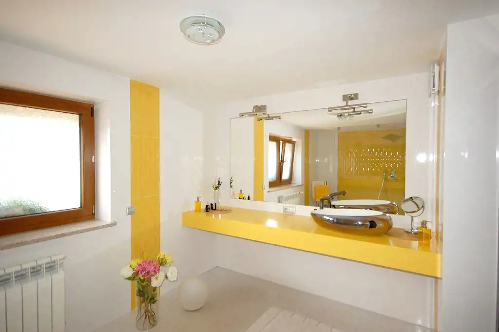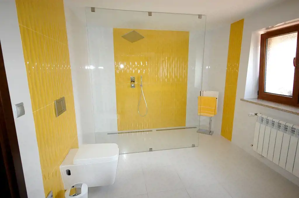 2. Łazienka ok. 11,70 m2 ściany i podłoga w nowoczesnej glazurze i terakocie,duża-nowoczesna kabina natryskowa z deszczownicą, podtynkowy komplet wc, podświetlane lustro+umywalka, zdobione-przyciemnione okno pcv, roleta zewnętrzna elektryczna