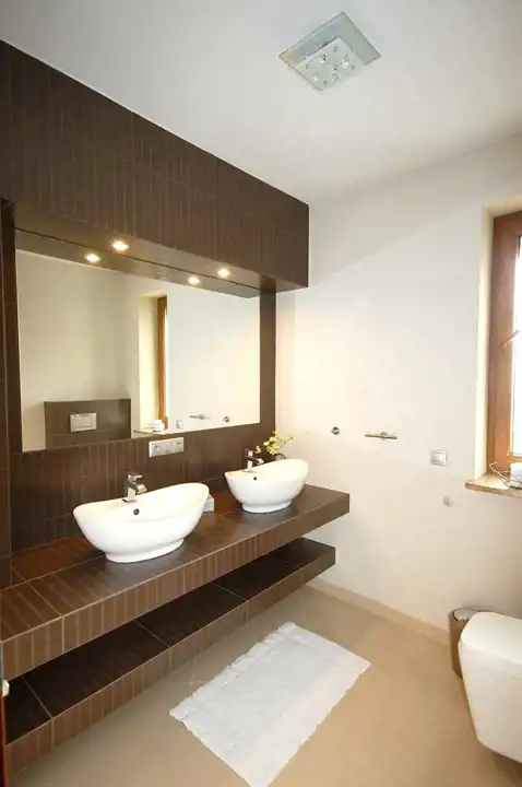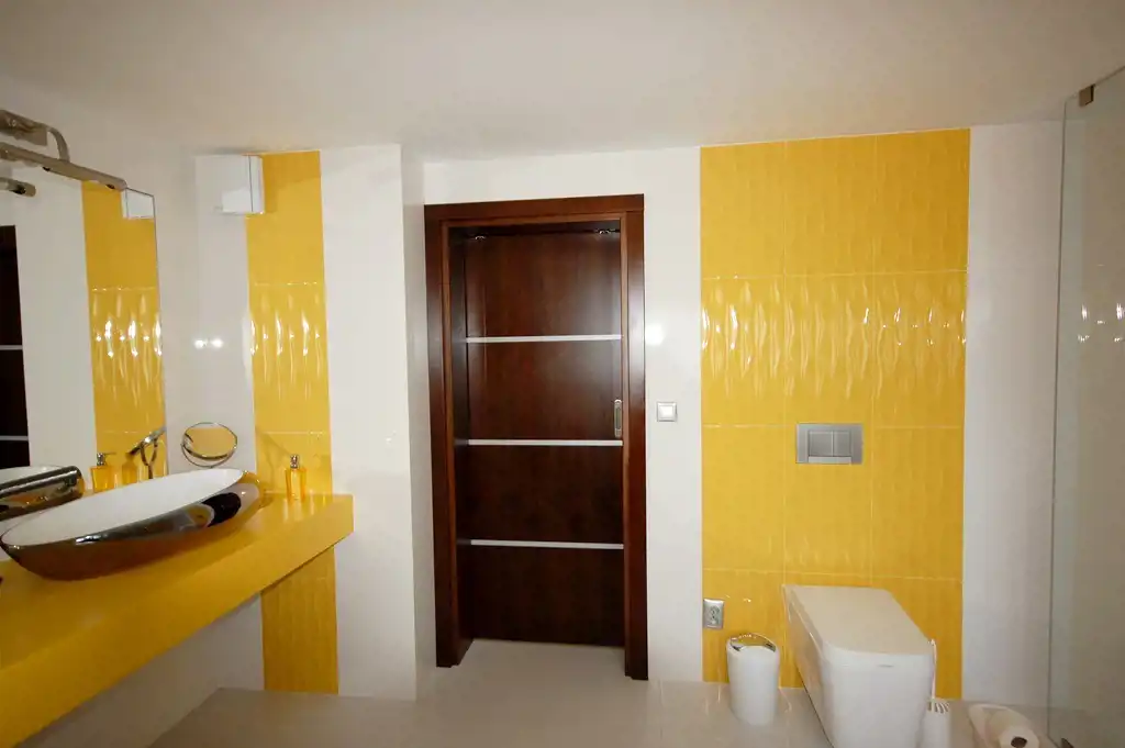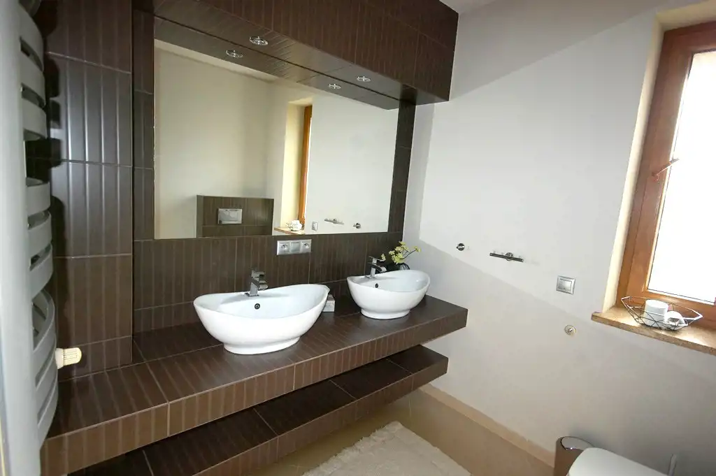 5.Łazienka ok. 4,50 m2, całość w glazurze i płytkach gresowych, dwustanowiskowa-nowoczesna umywalka, podtynkowy kompakt wc, naścienny grzejnik c.o.