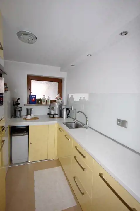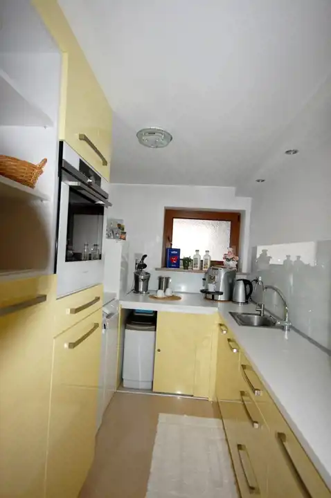 3. Kuchnia ok. 6,60 m2 podłoga w kaflach gresowych, ściany nad blatami zabudowy meblowej w szkle, okno pcv zdobione-przyciemnione, roleta zewnętrzna elektryczna, pozostająca w cenie pełna zabudowa meblowa + AGD/piekarnik i lodówka Siemens, zmywarka Bosch/, stacja filtrowania i uzdatniania wody z osmozą, piec gazowy "Junkers",oświetlenie ledowe