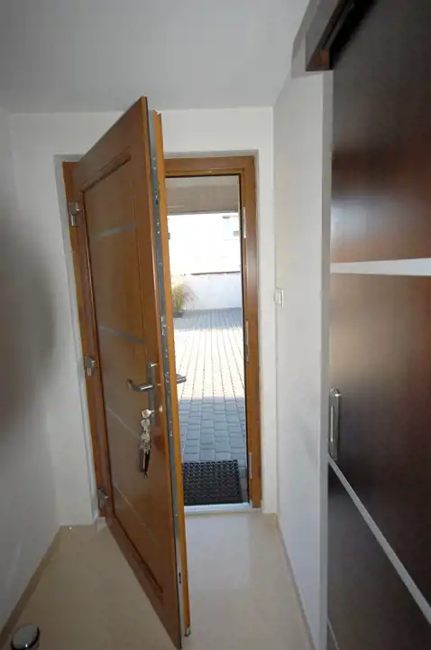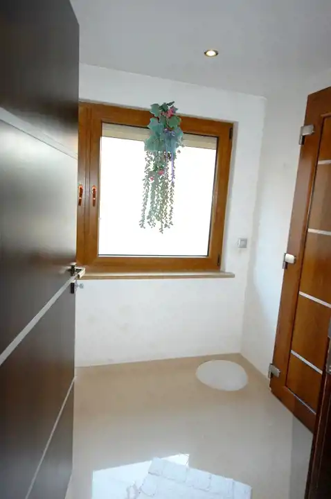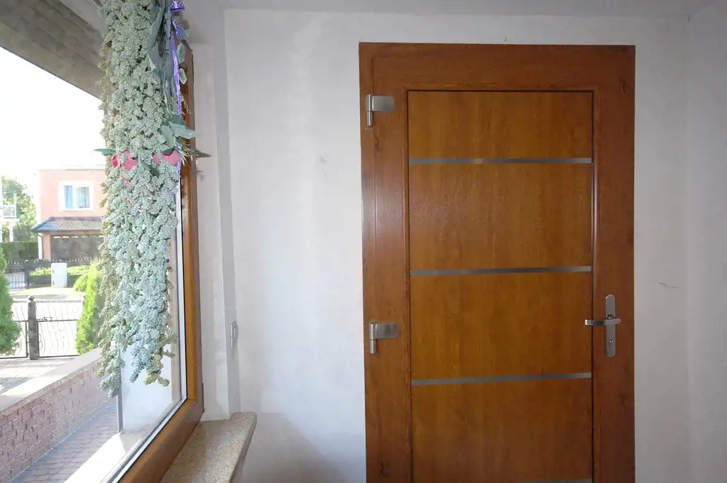 Wiatrołap ok. 4,80 m2 posadzka gres, ściany gipsowane-malowane, drzwi wejściowe metalowe-wzmacniane, duże okno pcv.
