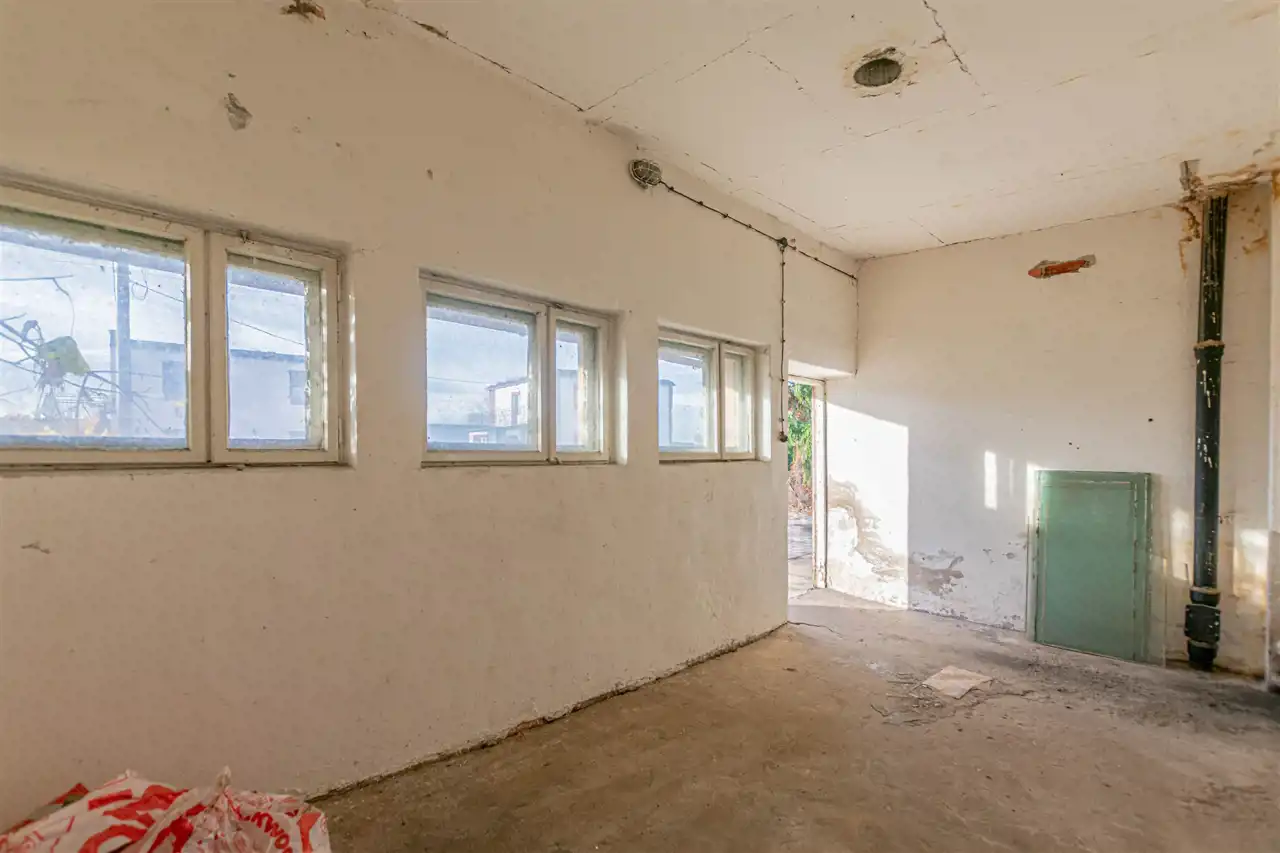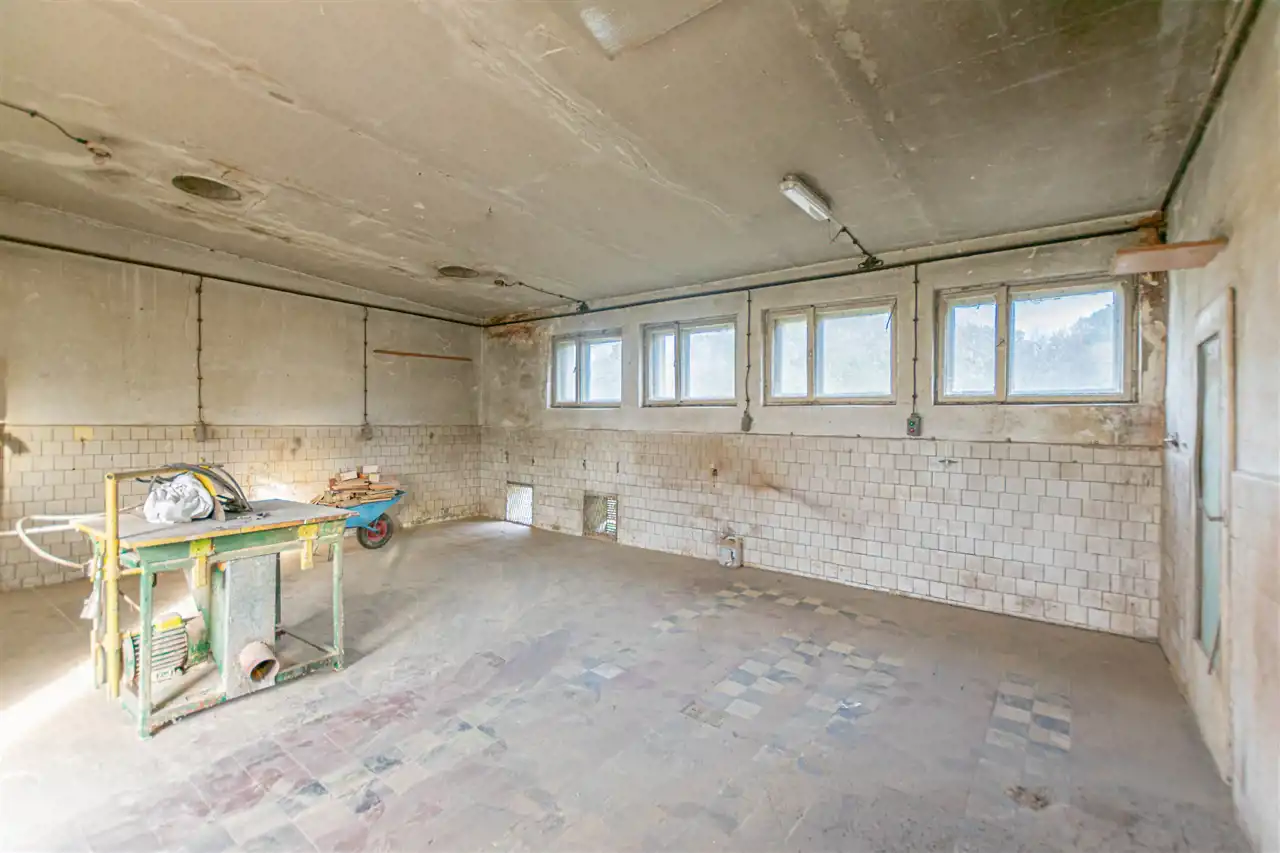 - pomieszczenie główne o pow. ok 50 m2; na podłodze beton i terakota; ściany malowane z glazurą; drzwi wejściowe metalowe; 7 okien drewnianych; rozdzielnia prądowa (prąd + siła),