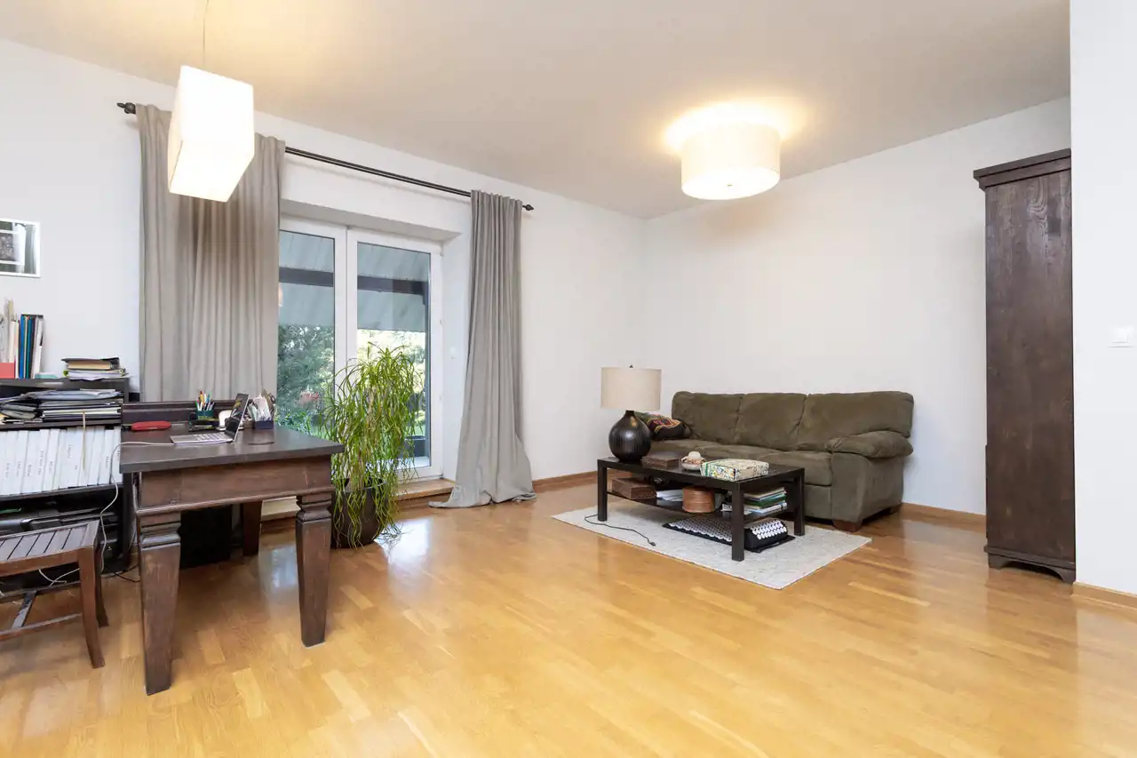W dużym salonie jest kominek, wyjście z salonu prowadzi na przestronny zadaszony taras, a z niego wychodzi się do zadbanego ogrodu. Jest w nim dużo miejsca na rekreację.