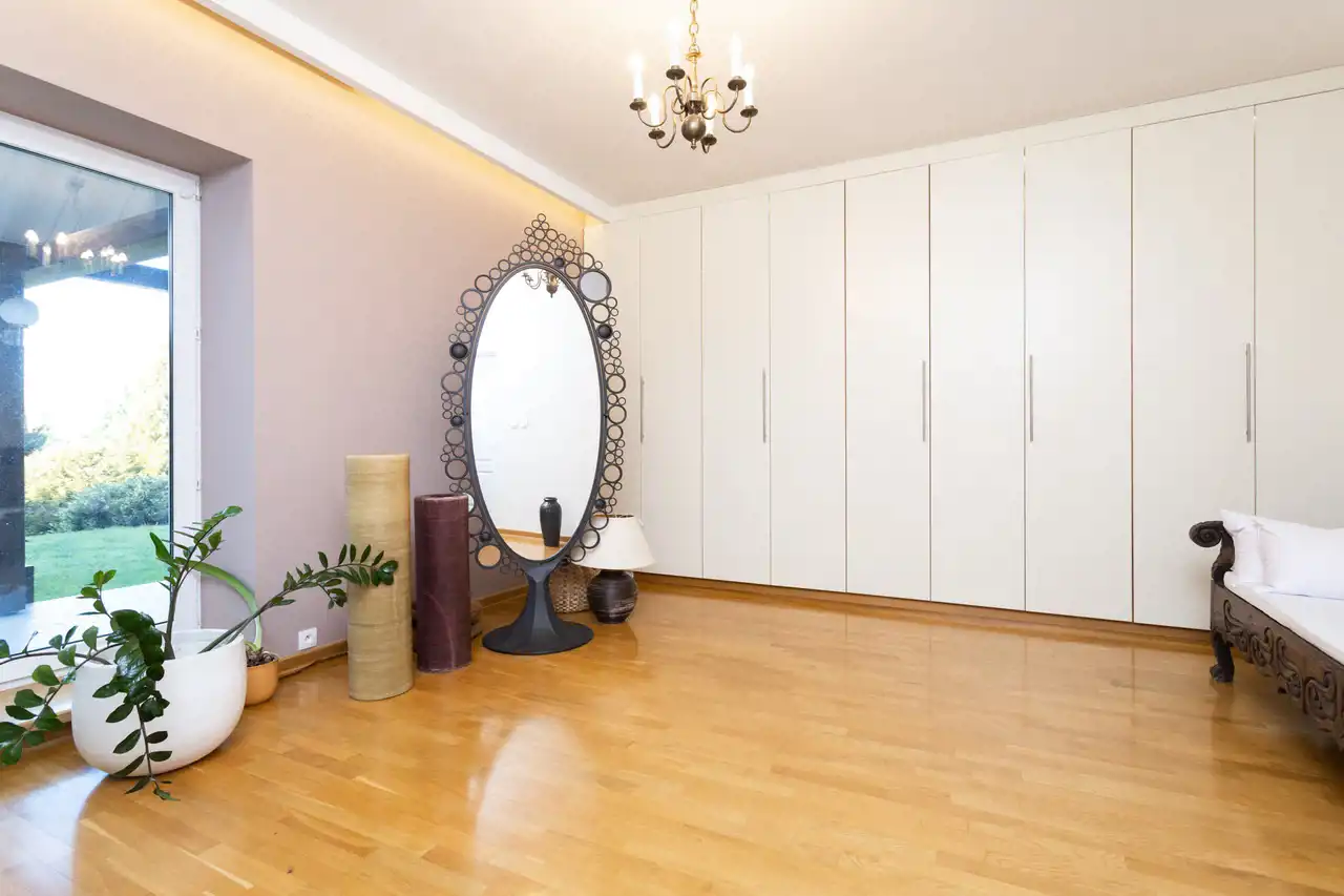 Ma on 16 przestronnych pokoi, dwie niezależne kuchnie, pięć łazienek, wysokie podpiwniczenie, gdzie znajdują się też sauna, czy salka do fitness.