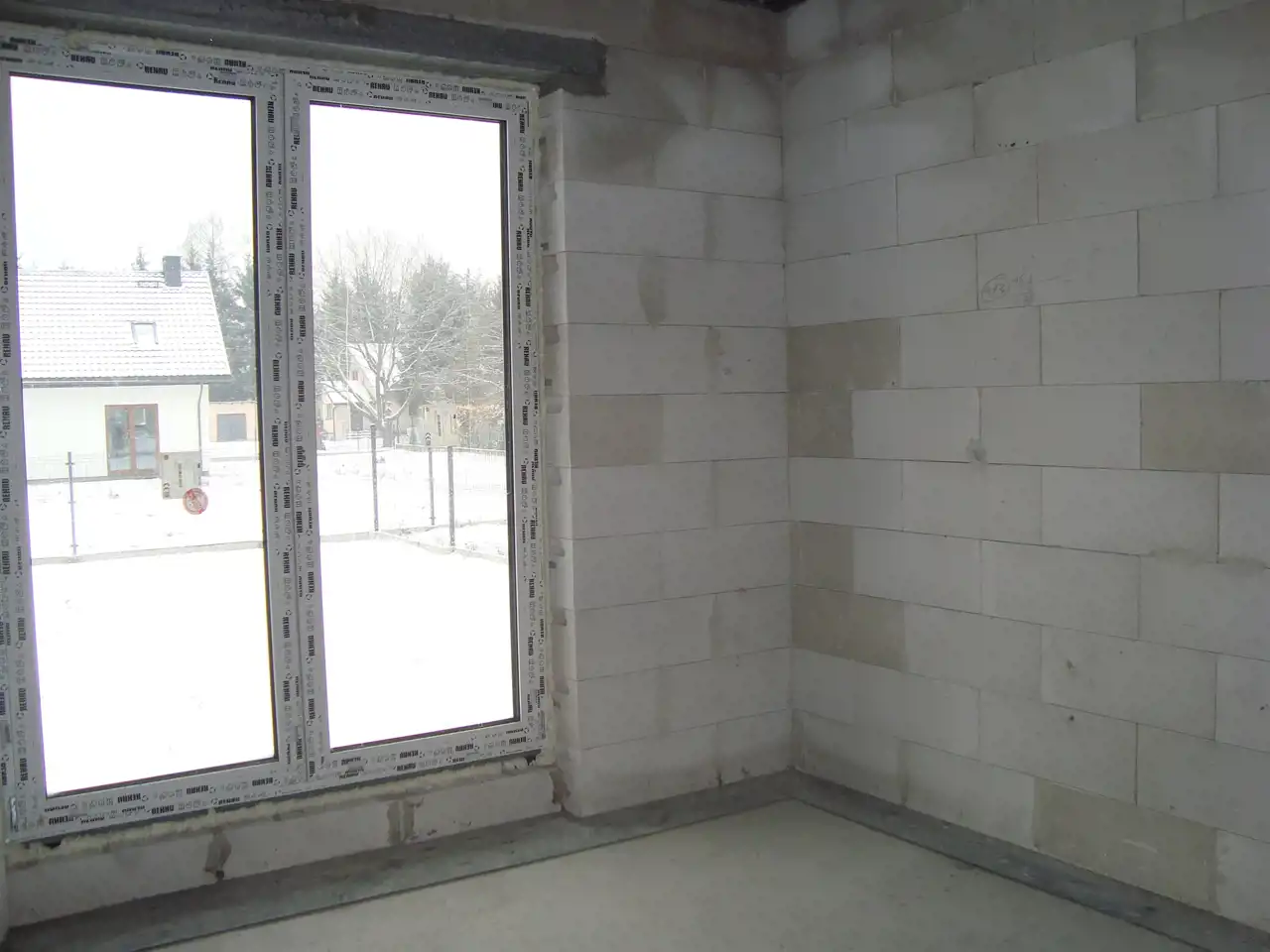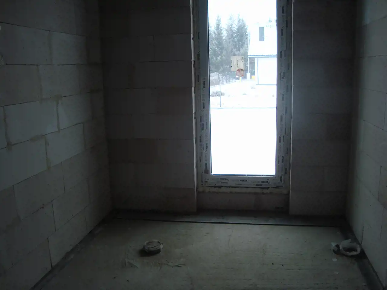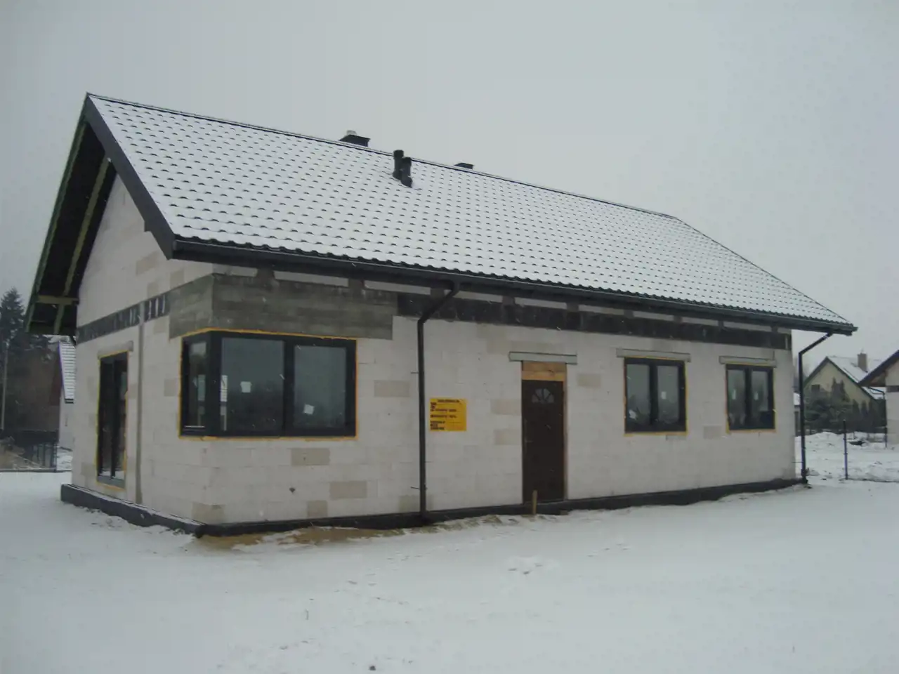 Zbudowany z bloczków betonu komórkowego. Dach pokryty blachodachówką. Okna PCV.