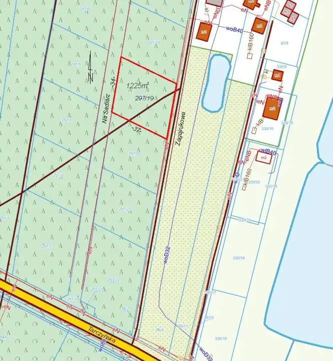 Działka leśno-budowlana 1225 m2 w Ojrzanowie gm. Żabia Wola. Kształt zbliżony do prostokąta 37x34 m, krótszym, wschodnim bokiem do wewnętrznej, utwardzonej drogi, w której jest prąd, a wodociąg jest w odl. 135 m. Dojazd do działki możliwy jest z dwóch stron i obie drogi są gminne, choć leśna droga po zachodniej stronie w ogóle nie jest urządzona. W planie zagospodarowania przestrzennego zabudowa mieszkaniowa jednorodzinna wolnostojąca oraz budynki gospodarcze i garaże do wys. 3 kondygnacji plus podpiwniczenie. W rejestrze gruntów teren LsVI, a plan pozwala na maks.250m2 wylesienia pod zabudowę i utwardzenie terenu.