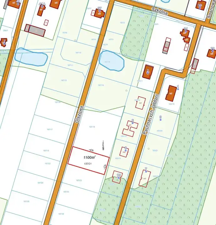 Działka budowlana 1100 m2 w Osowcu, gm. Żabia Wola. Prostokąt 23x48 m, krótszym bokiem do drogi dojazdowej, ul. Olszowej. Droga będzie utwardzana w najbliższym czasie. Działka położona 200 m od asfaltowej, oświetlonej ulicy Szkolnej, w której jest prąd, wodociąg, gaz, światłowód i kanalizacja. W drodze dojazdowej w realizacji są prąd i wodociąg. W planie zagospodarowania przestrzennego zabudowa mieszkaniowa jednorodzinna wolnostojąca lub bliźniacza do 3 kondygnacji wysokości plus podpiwniczenie i z zachowaniem min. 60% powierzchni biologicznie czynnej. Plan zezwala również na towarzyszącą zabudowę gospodarczą i usługową.