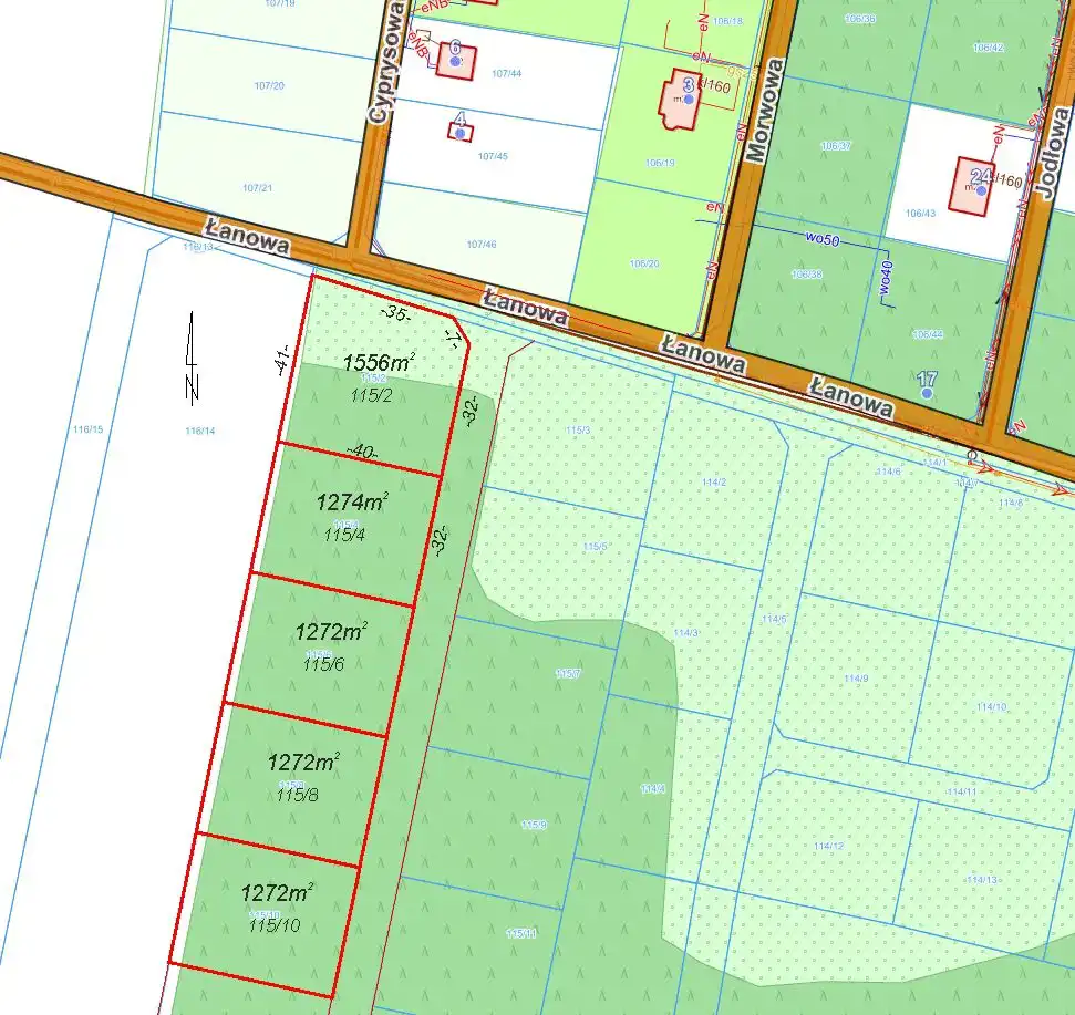Prostokąt 32x40m, krótszym, wschodnim bokiem do wewnętrznej drogi. Położona w drugiej linii od utwardzonej, gminnej ulicy Łanowej, w której jest prąd i wodociąg. Do światłowodu ok. 80m, a do gazu 130m. W planie zagospodarowania przestrzennego zabudowa mieszkaniowa jednorodzinna wolno stojąca lub bliźniacza wraz z budynkami gospodarczymi i garażami. Maks. wys. zabudowy - 3 kondygnacje plus podpiwniczenie, a minimalna powierzchnia biologicznie czynna - 60%.