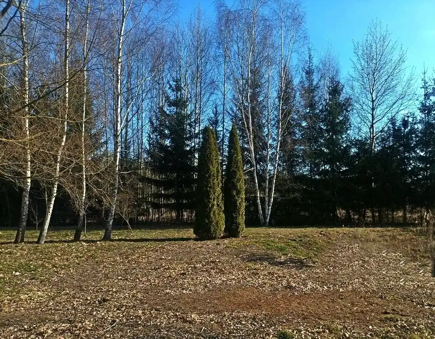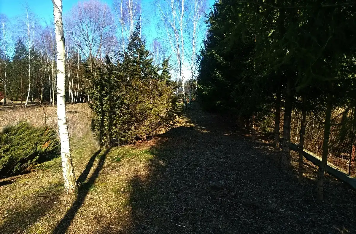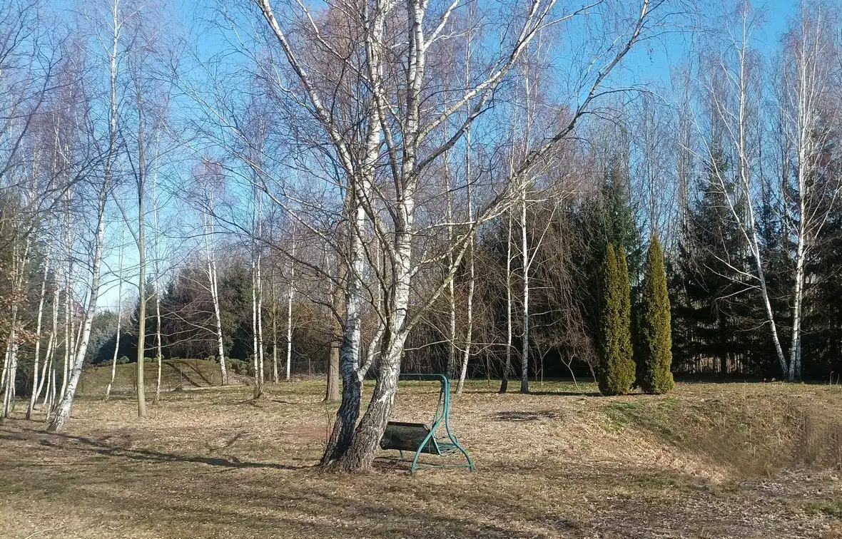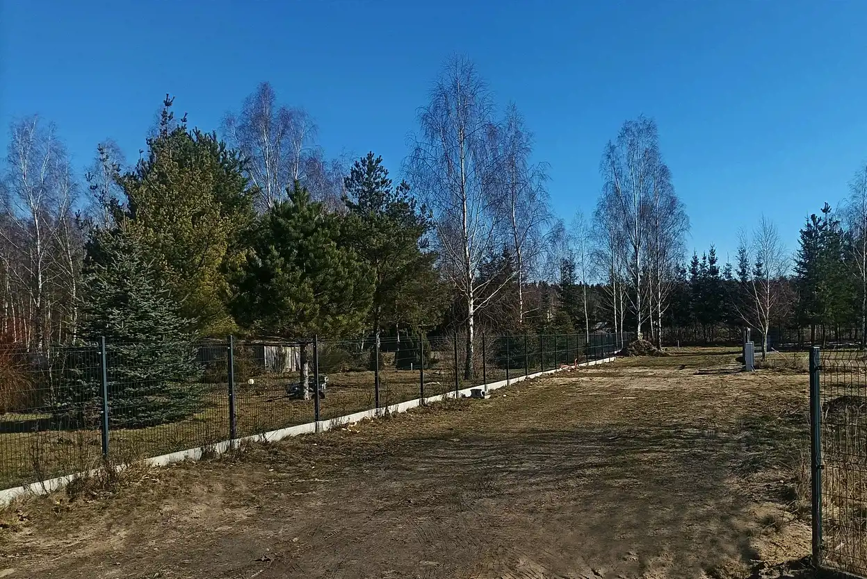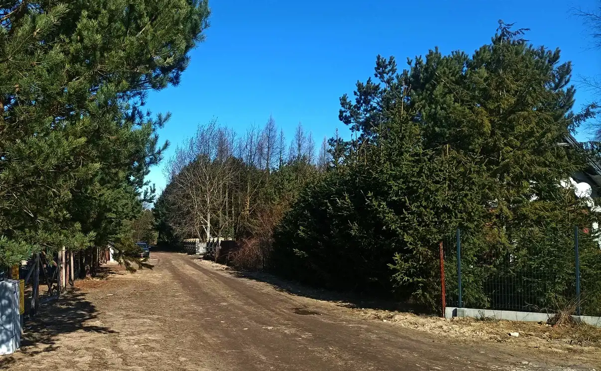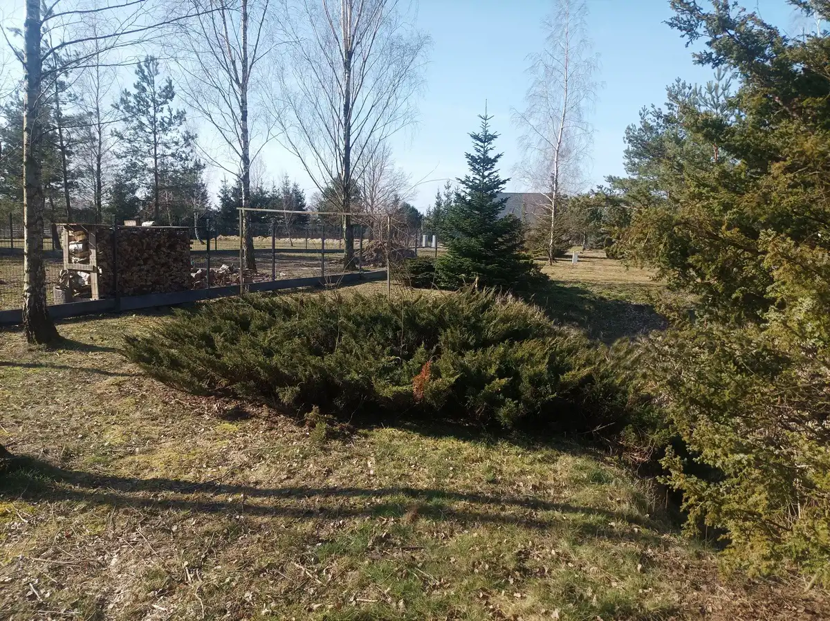 Działka zadbana, używana na co dzień, z pojedynczymi nasadzeniami brzozy i wierzby, a także jałowca i świerku wzdłuż długiego boku. Działka ogrodzona z trzech stron panelami i siatką na podmurówce. Położona pośród nowej zabudowy willowej, ale bardzo blisko dużego lasu Młochowskiego. Wygodna komunikacja ze światem, zarówno samochodem, jak i busami bezpośrednio do Warszawy lub do Grodziska i dalej PKP lub WKD.