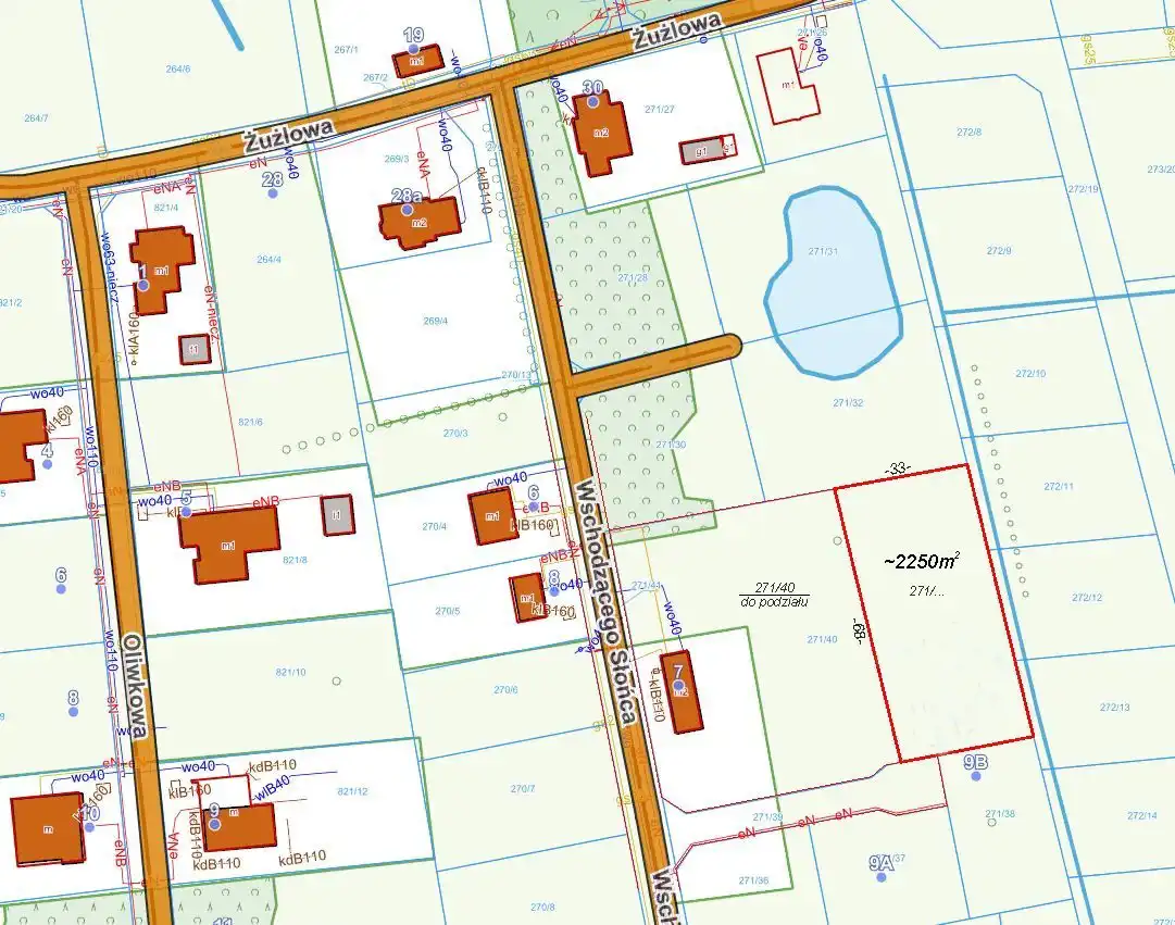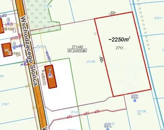 Działka budowlana ok. 2250 m2 w Żelechowie gm. Żabia Wola. Działka w trakcie wydzielania z większej całości jako zgrabny prostokąt ok. 33x68 m, położony w drugiej linii od ul. Wschodzącego Słońca. W ulicy jest dostępny wodociąg, gaz i światłowód, a w drodze dojazdowej, przy działce jest prąd. W planie zagospodarowania przestrzennego zabudowa jednorodzinna wolno stojąca lub bliźniacza wraz z budynkami gospodarczymi i garażami. Maks. wys. zabudowy domu – 3 kondygnacje plus piwnica, powierzchnia biologiczne czynna – min. 60 % pow. działki.