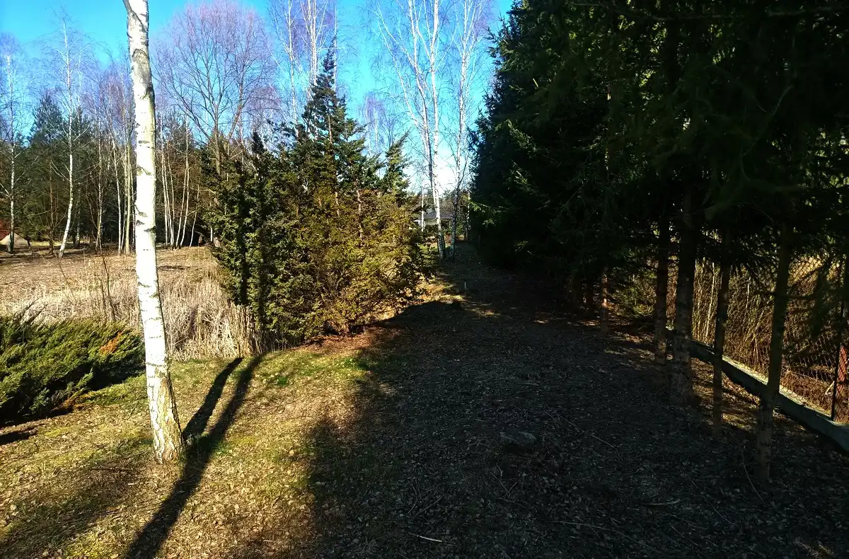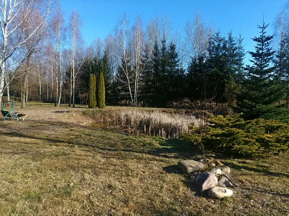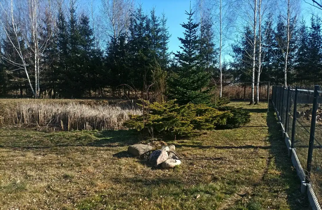 Działka zadbana, używana na co dzień, z pojedynczymi nasadzeniami brzozy i wierzby, a także świerku wzdłuż długiego boku. W części południowej działki znajduje się staw ok. 300 m2 obsadzony jałowcami. Staw nie jest ujęty w rejestrze gruntów i ewidencji Wód Polskich, jest więc możliwość zasypania go lub przebudowy. Działka ogrodzona z trzech stron panelami i siatką na podmurówce. Położona pośród nowej zabudowy willowej, ale bardzo blisko dużego lasu Młochowskiego. Wygodna komunikacja ze światem, zarówno samochodem, jak i busami bezpośrednio do Warszawy lub do Grodziska i dalej PKP lub WKD.