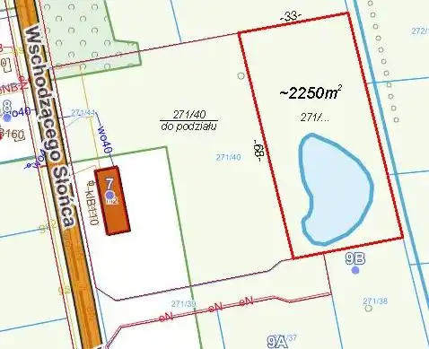 Działka budowlana ok. 2250 m2 w Żelechowie gm. Żabia Wola. Działka w trakcie wydzielania z większej całości jako zgrabny prostokąt ok. 33x68 m, położony w drugiej linii od ul. Wschodzącego Słońca. W ulicy jest dostępny wodociąg, gaz i światłowód, a w drodze dojazdowej, przy działce jest prąd. W planie zagospodarowania przestrzennego zabudowa jednorodzinna wolno stojąca lub bliźniacza wraz z budynkami gospodarczymi i garażami. Maks. wys. zabudowy domu – 3 kondygnacje plus piwnica, powierzchnia biologiczne czynna – min. 60 % pow. działki.