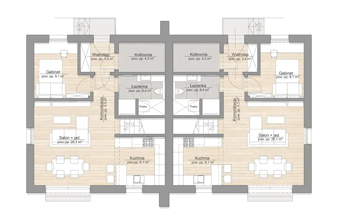 Parter (55,7m2 po podłodze): wiatrołap (3,4m2), komunikacja (4,3m2), salon + jadalnia (20,1m2), kuchnia (8,1m2), gabinet (9,1m2), łazienka (6,4m2), kotłownia (4,3m2)