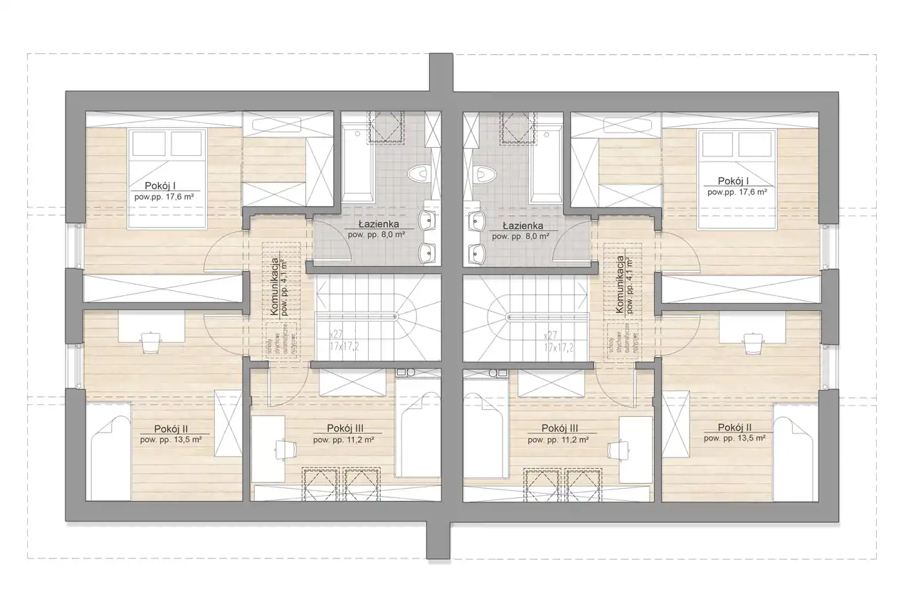 Poddasze (55,7m2 po podłodze): hol (4,1m2), pokój (17,6m2), pokój (13,5m2), pokój (11,2m2), łazienka (8m2)